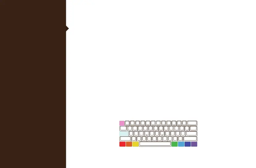 右Ctrl及Caps Lock鍵皆會亮起,燈色分別為粉、紅、橙、黃、綠、藍、靛、紫、