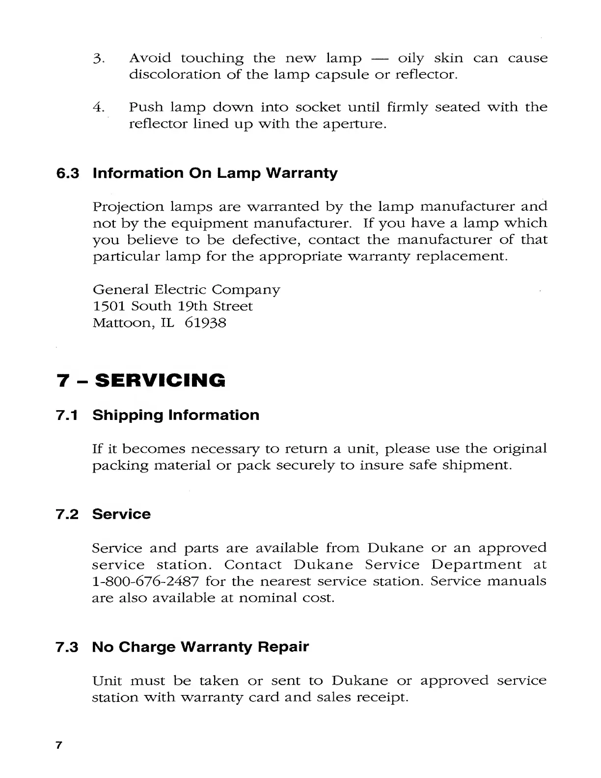 Dukane 28A640 - Information on Lamp Warranty; 7 Servicing; Shipping Information; Service