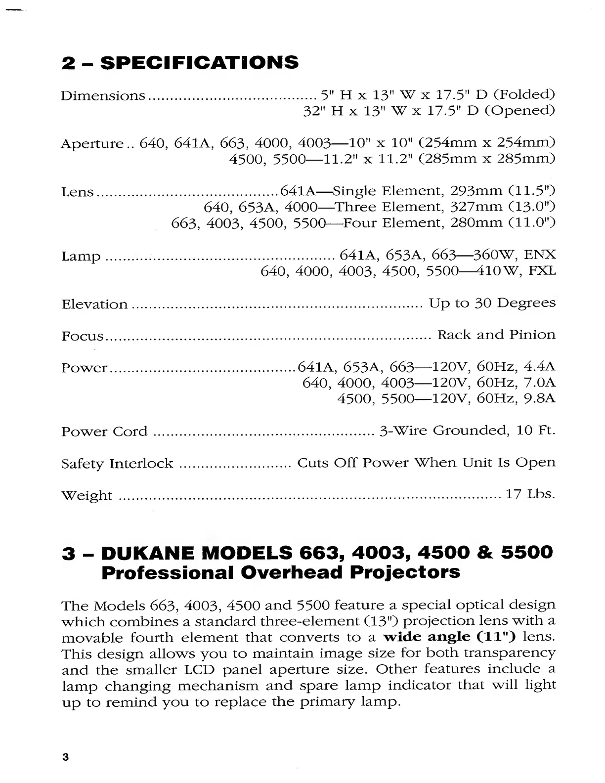 Dukane 28A640 - 2 Specifications.3; 3 Dukane Models 663, 4003, 4500 and 5500.3