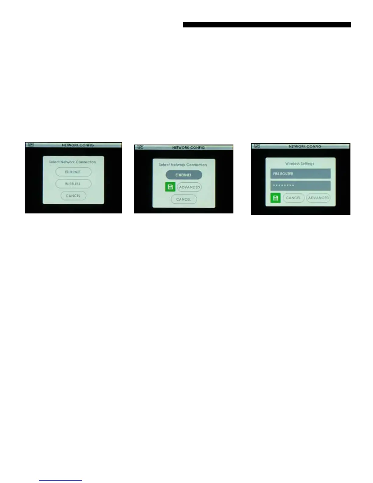 and select NETWORK CONFIG. Select your type of connection (ETHERNET or WIRELESS) and press the green SAVE button.