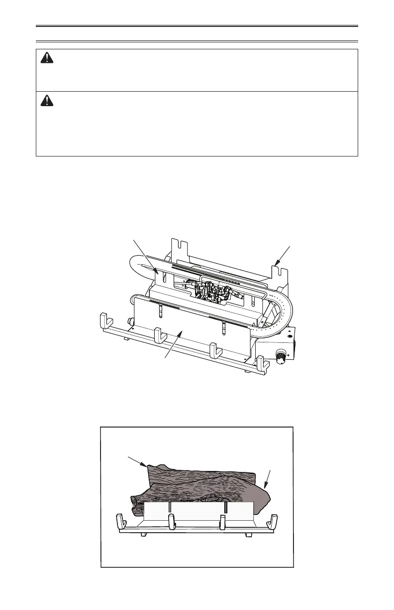 After installing logs, add decorative cinders around the grate base, do not place any decora-