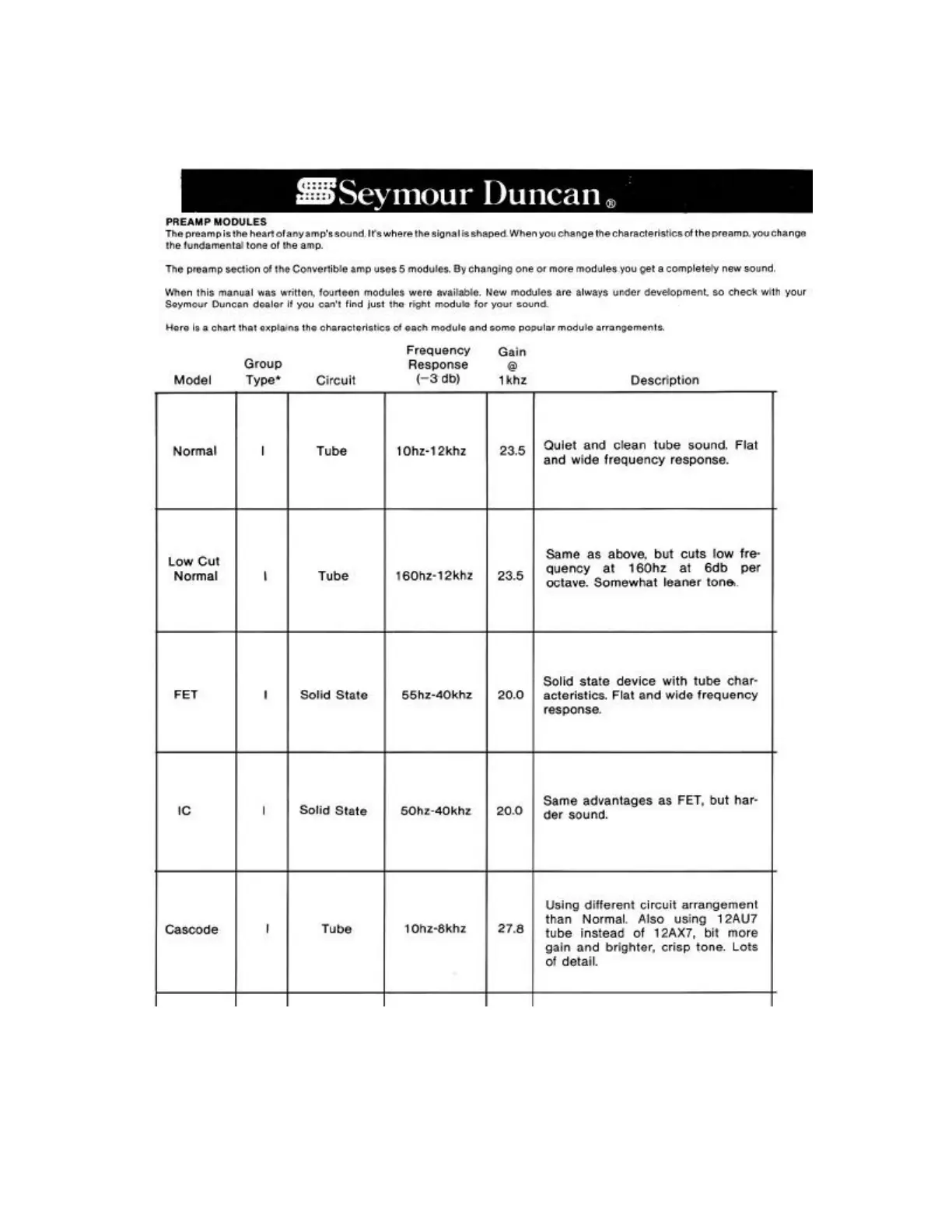 Duncan Convertible Head - Preamp Module Details; Module Characteristics Chart; Normal and Low Cut Normal Modules