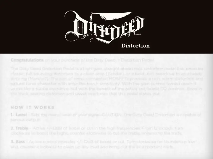 1. Level - Sets the overall level of your signal. CAUTION: The Dirty Deed Distortion is capable of