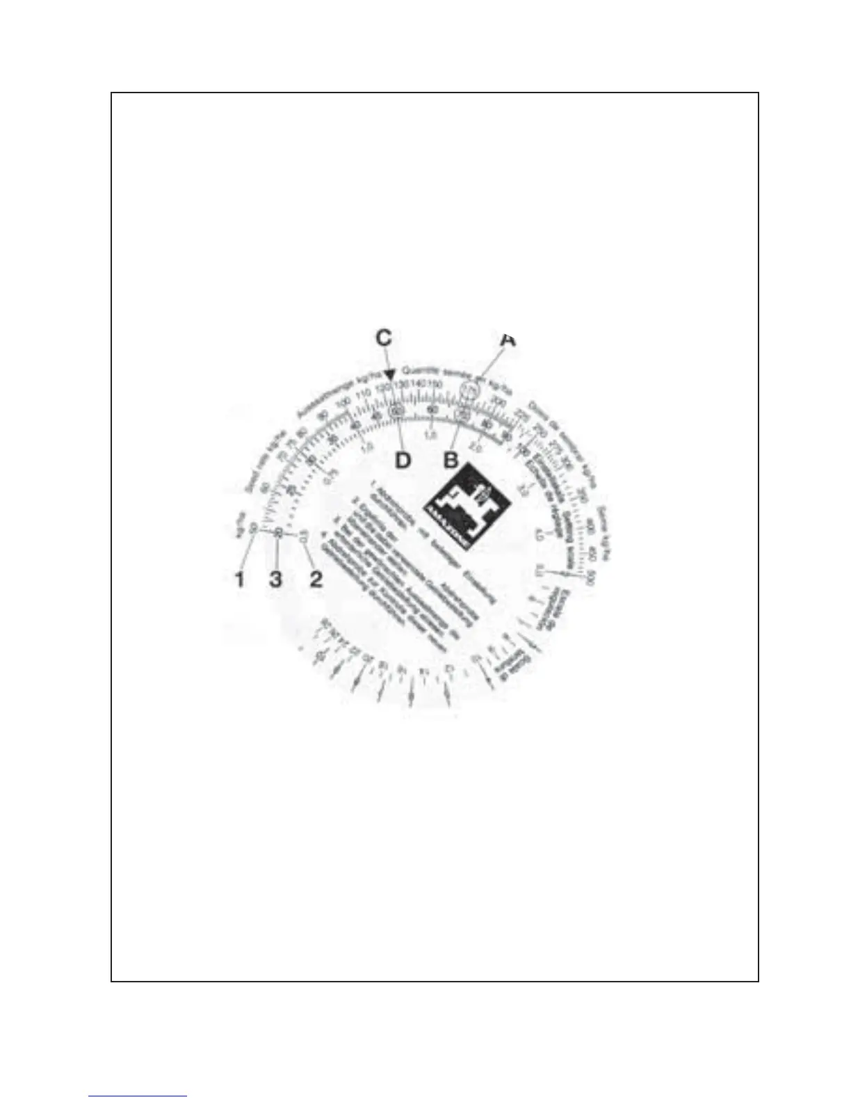 enclosed disc calculator. The disc calculator consists of 3 scales. An outer white scale (1) for