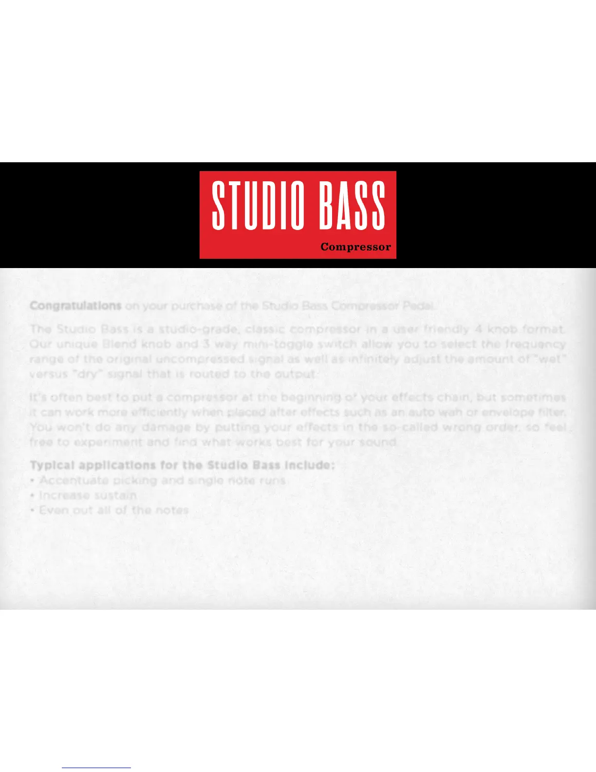 Congratulations on your purchase of the Studio Bass Compressor Pedal.