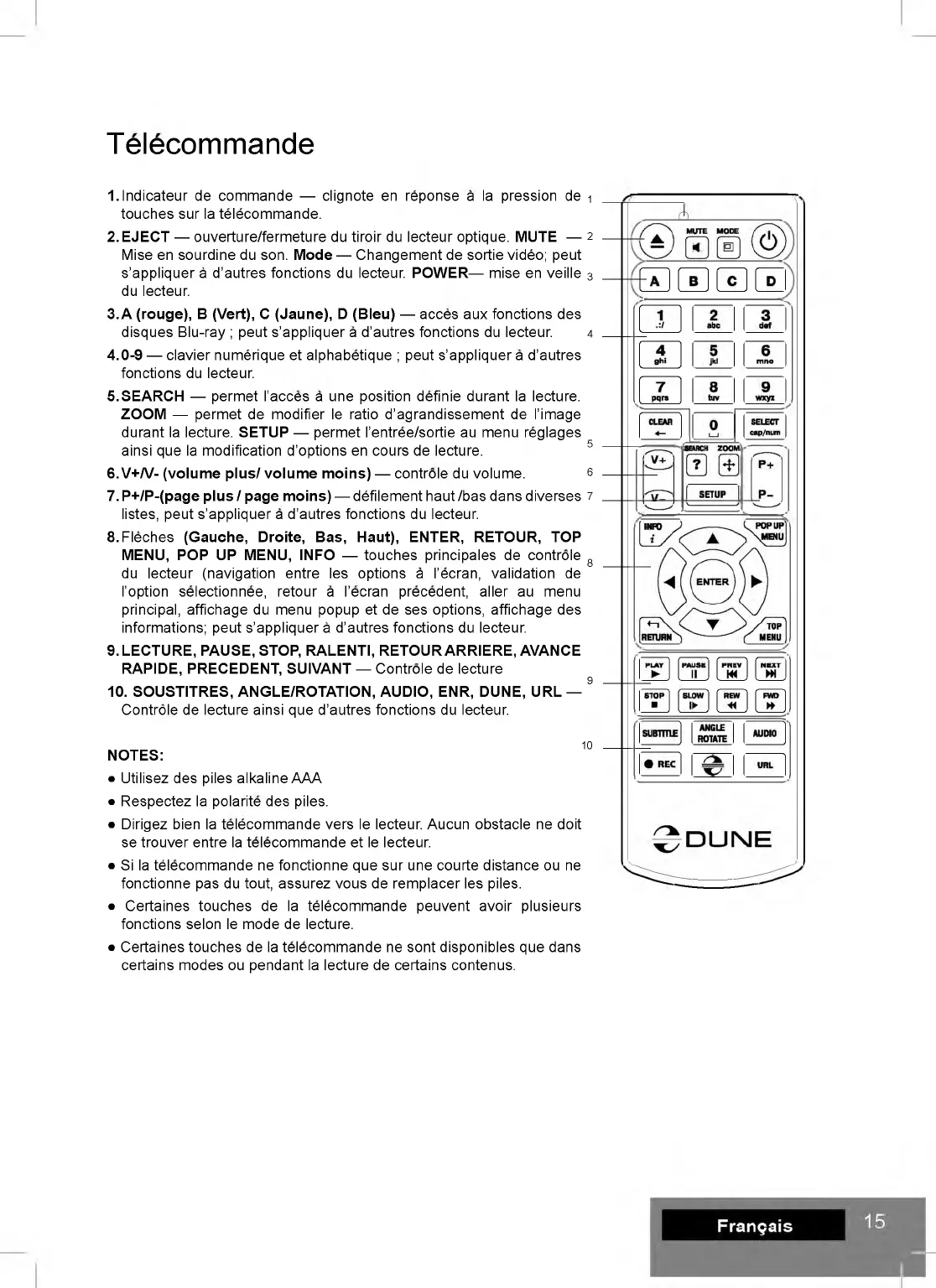• Dirigez bien la telecommande vers le lecteur. Aucun obstacle ne doit