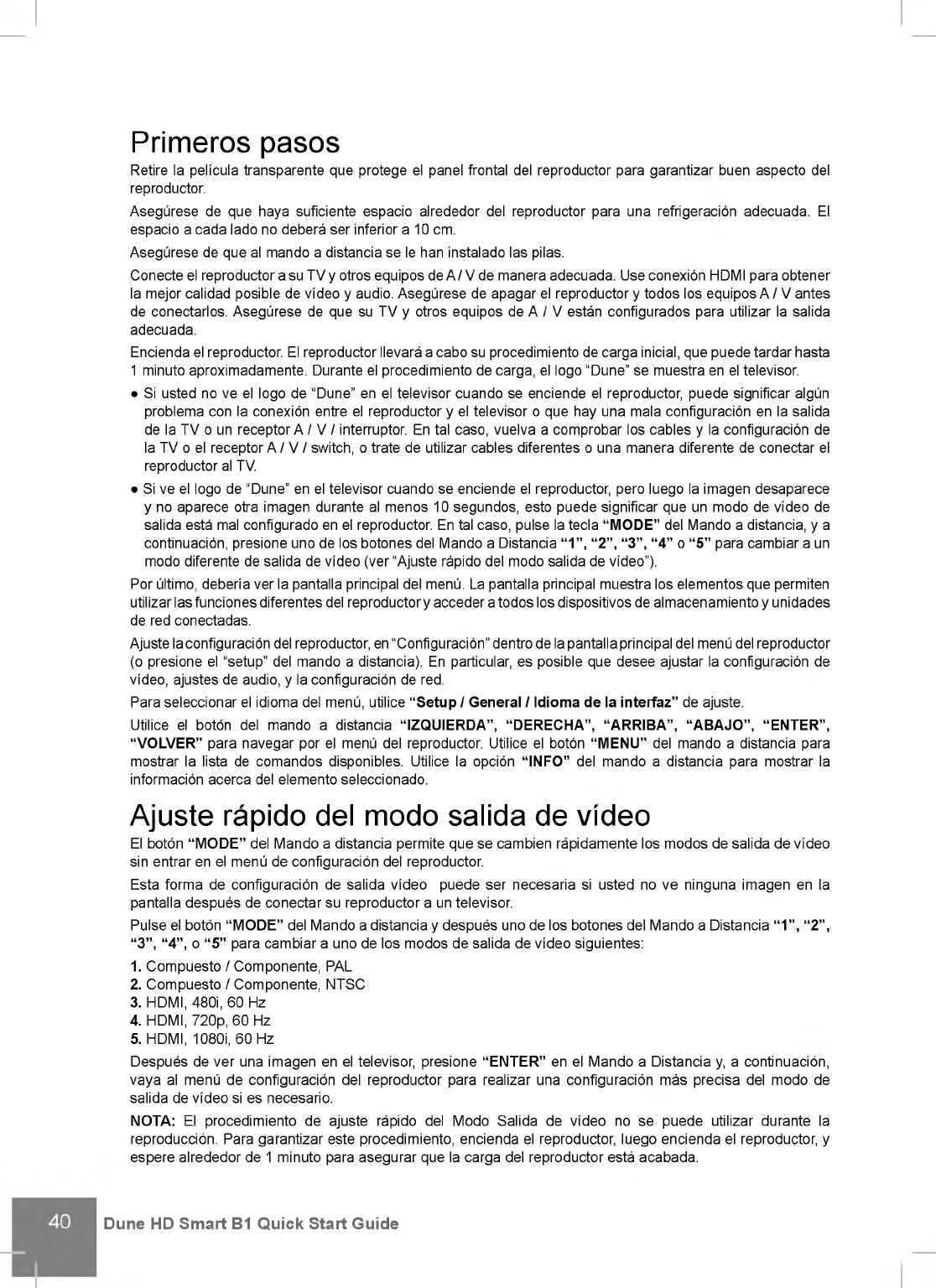 • Si usted no ve el logo de “Dune” en el televisor cuando se enciende el reproductor, puede significar algun