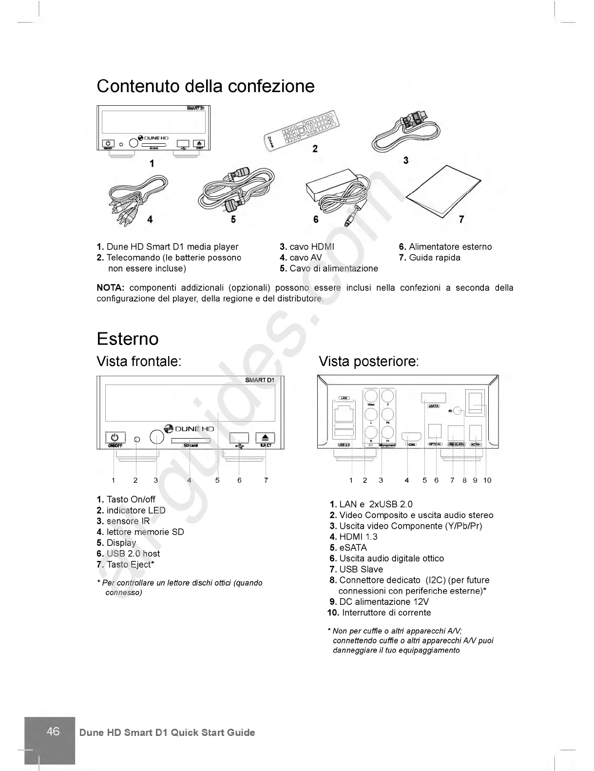 1. Dune HD Smart D1 media player 3. cavo HDMI 6. Alimentatore esterno