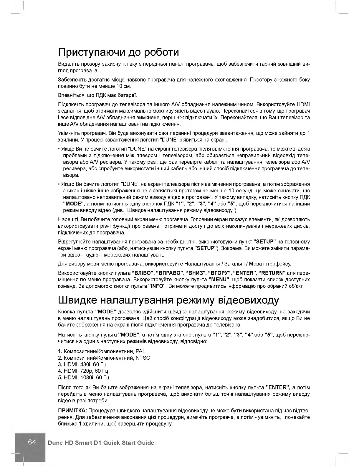 Кнопка пульта "MODE" дозволяе здшснити швидке налаштування режиму вщеовиходу, не заходячи