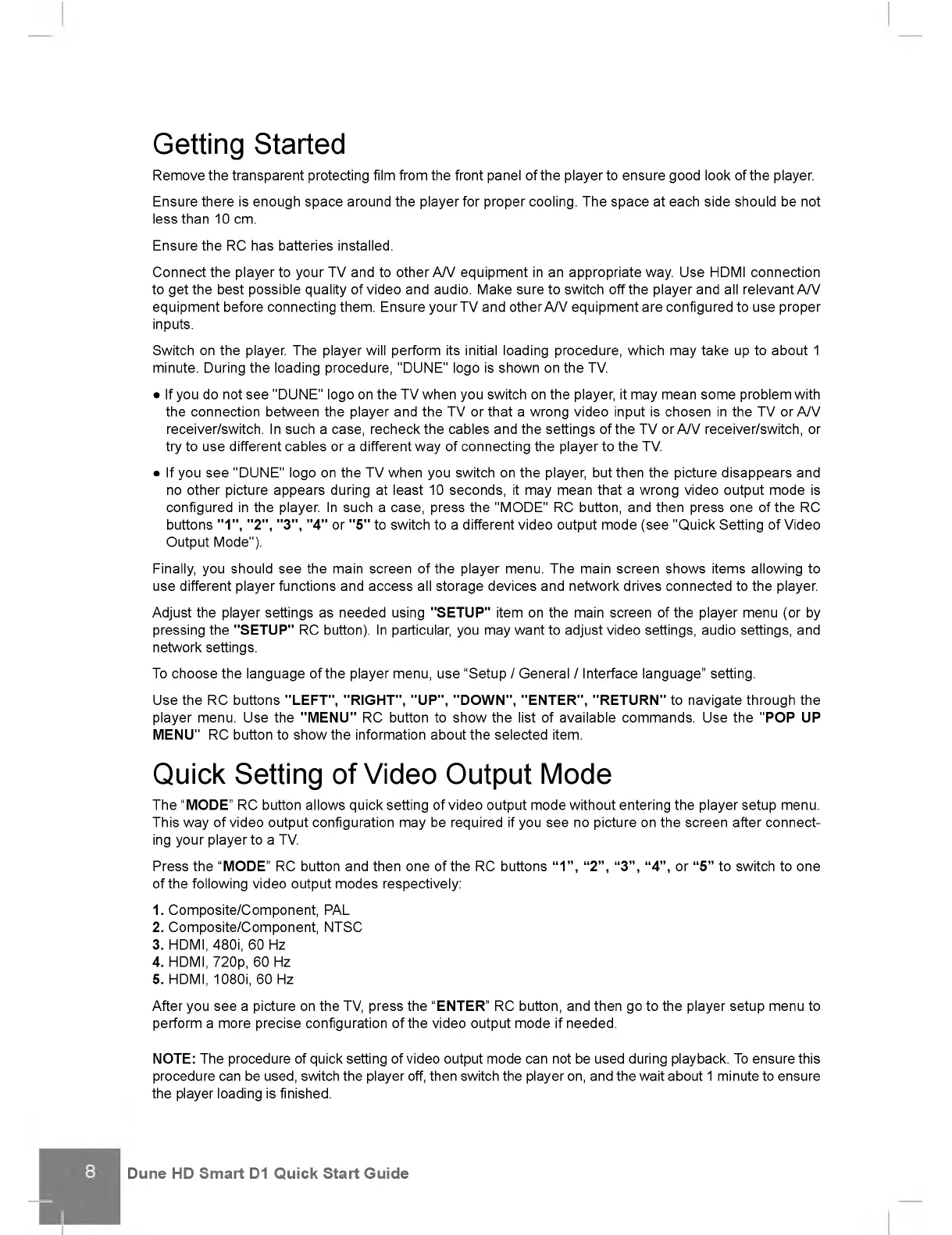• If you do not see "DUNE" logo on the TV when you switch on the player, it may mean some problem with