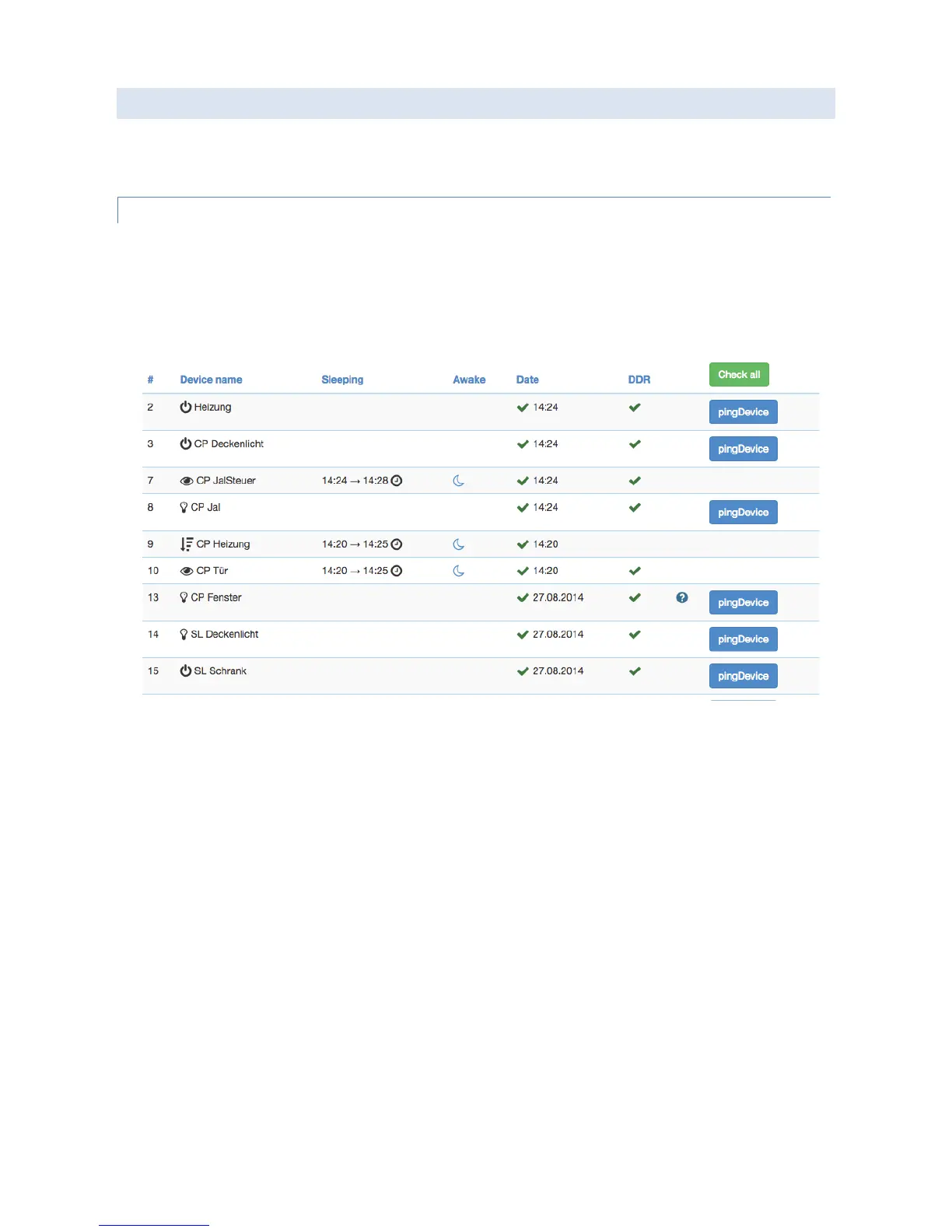 confirmed sending or reception). The green checkmark indicates that the device is alive. A red sign indicates that the