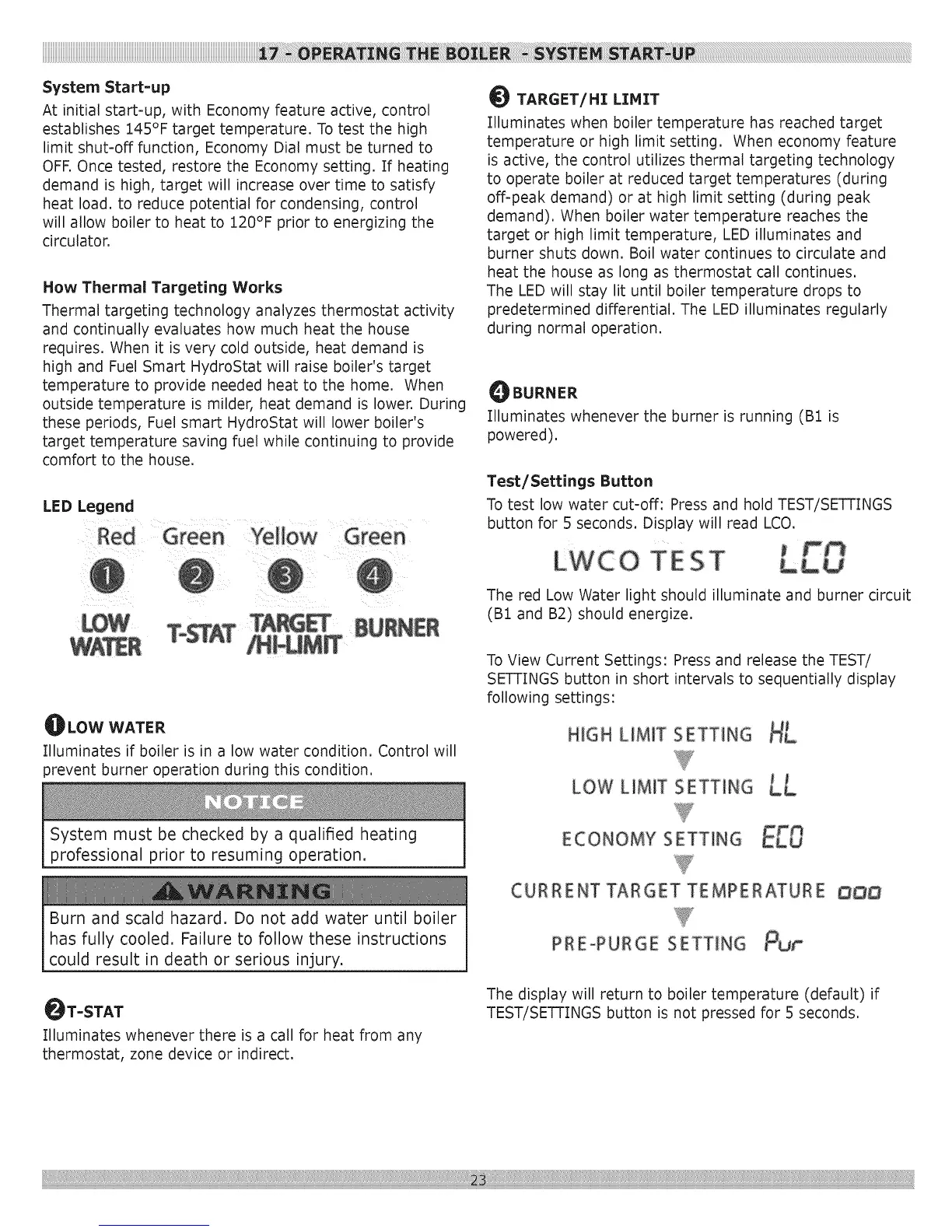 To test low water cut-off: Press and hold TEST/SETTINGS