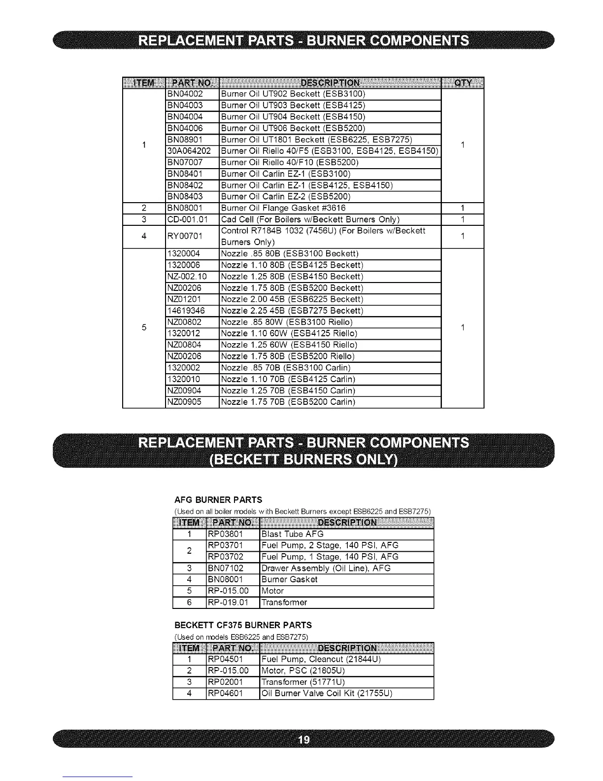 (Used on all boiler models with Beckett Burners except ESB6225 and ESB7275