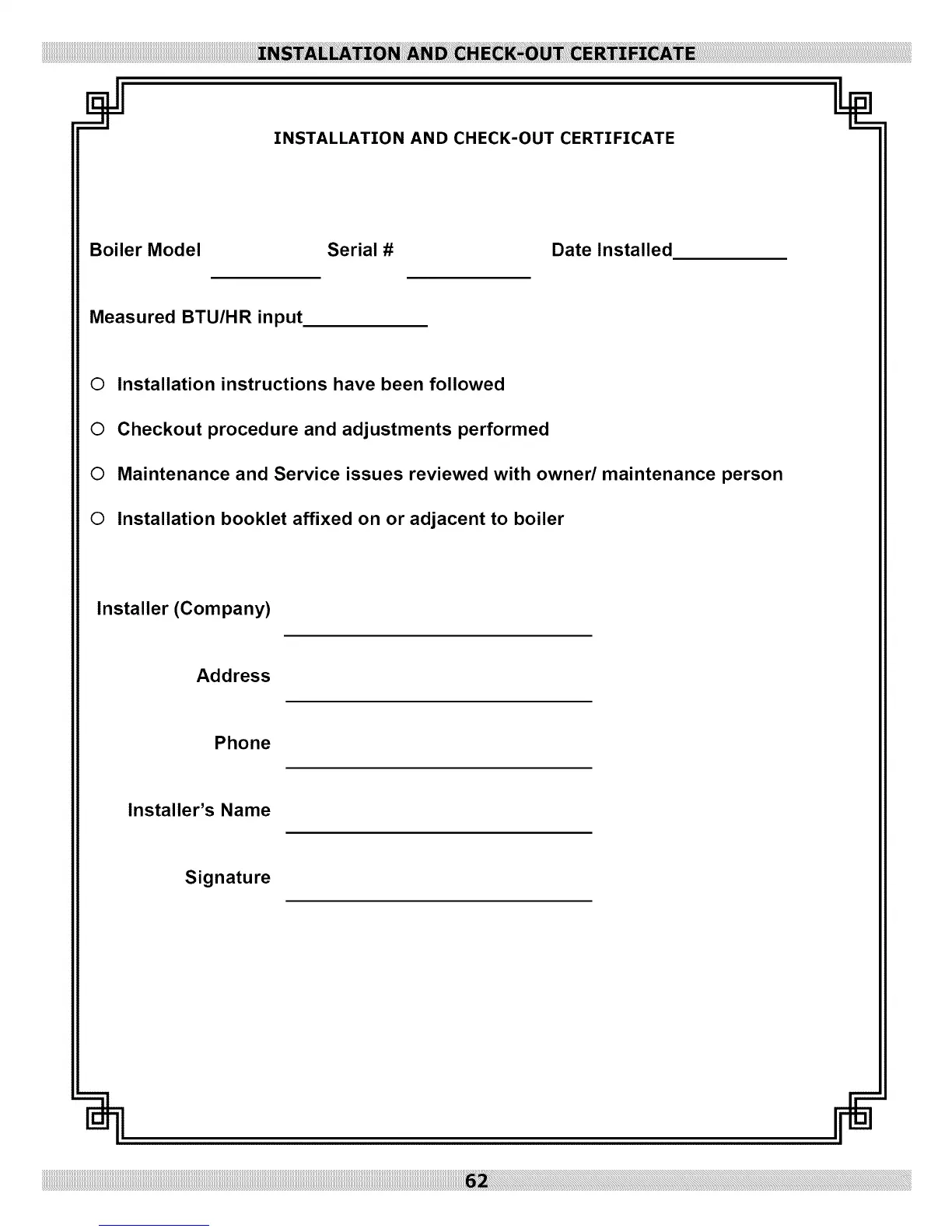INSTALLATION AND CHECK-OUT CERTIFICATE