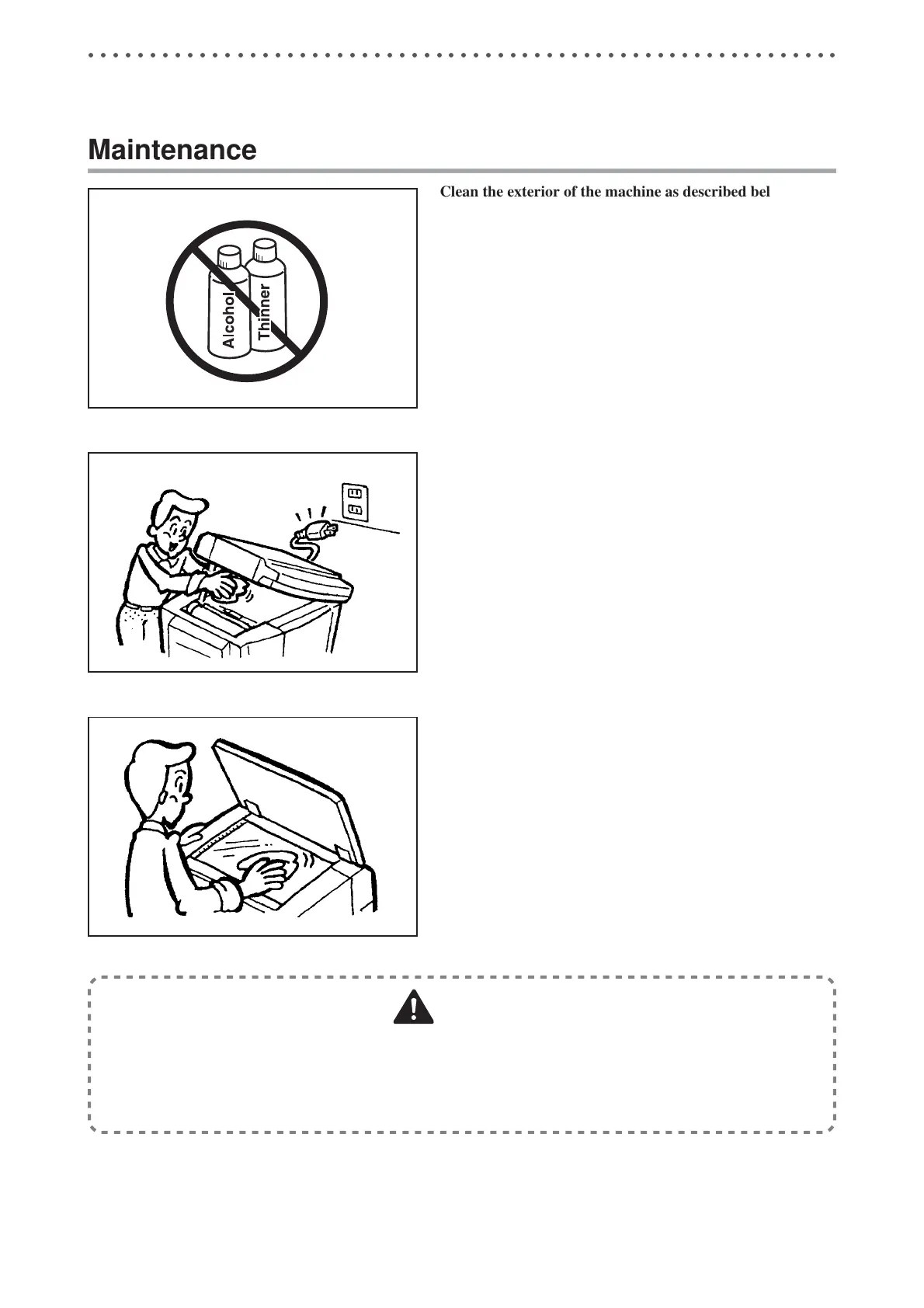 • Prevent water and neutral cleansers from getting inside the machine. If liquids spill inside the ma-