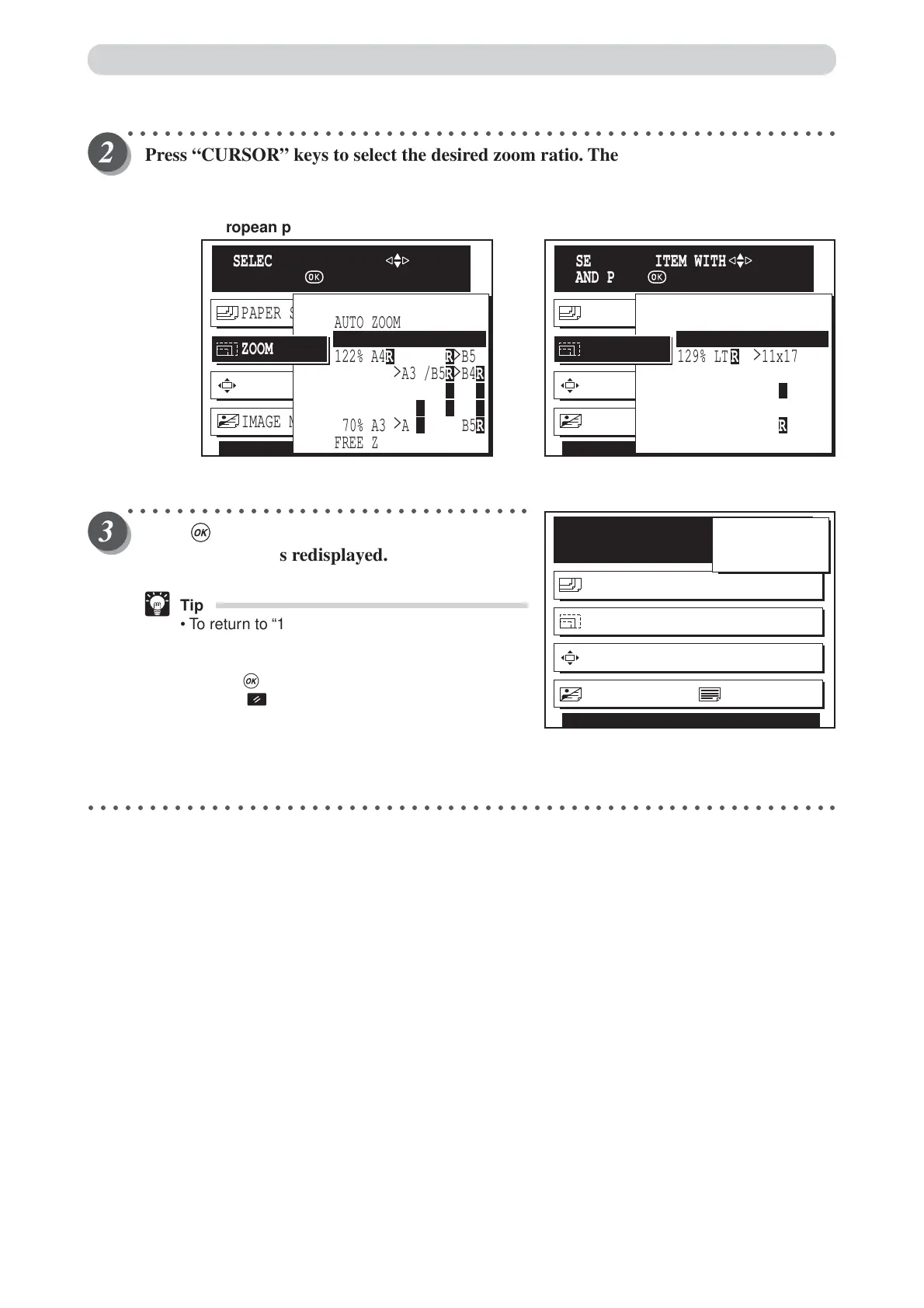 Press “CURSOR” keys to select the desired zoom ratio. The selected zoom ratio is