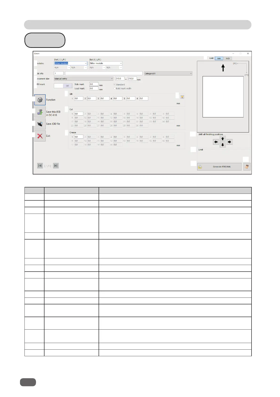 9 Unit Select a unit of values to enter out of mm or inch.