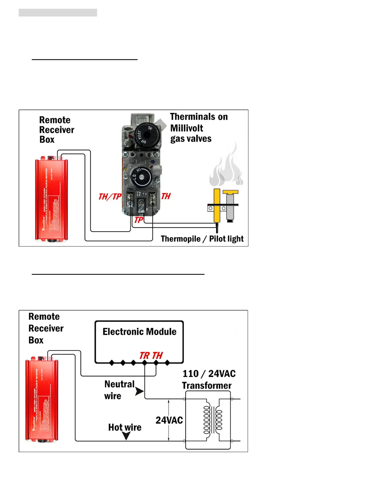 Connect the two 18 gauge stranded or solid wires of the Remote receiver box to the Millivolt gas valve at the TH & TH/TP