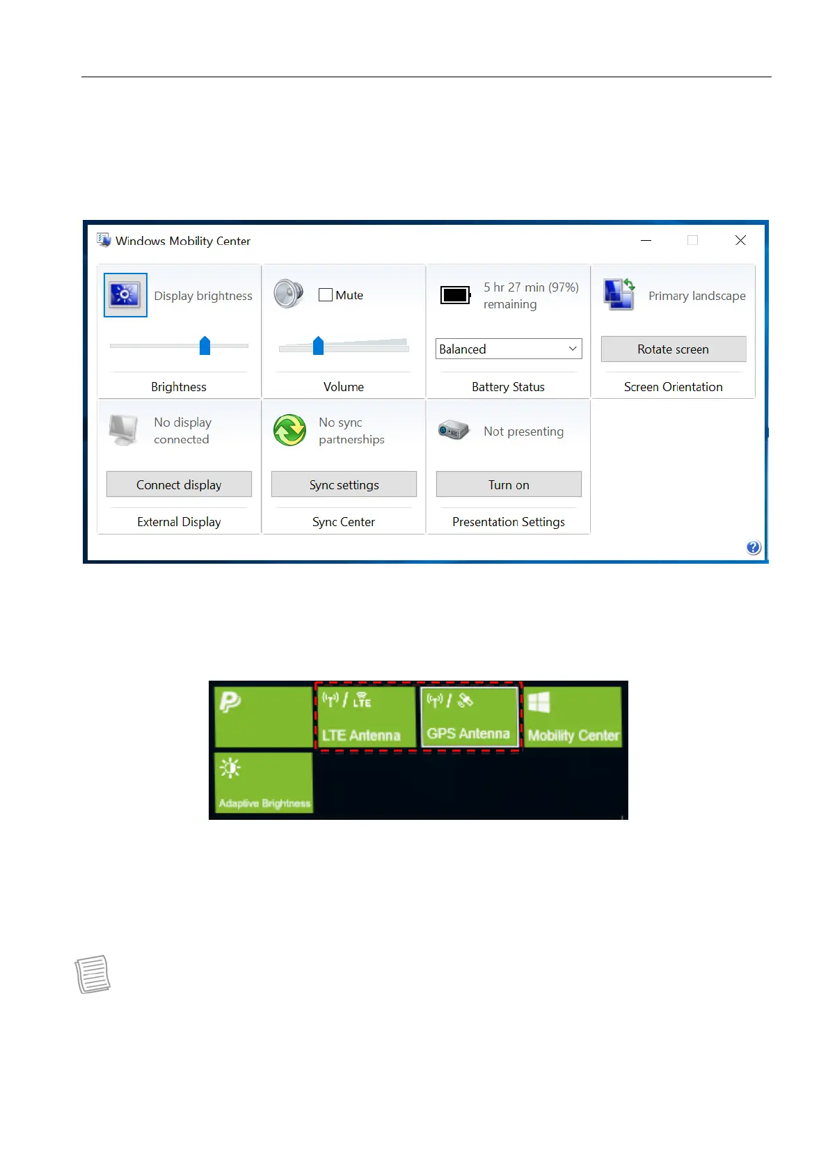 Tap the Mobility Center tab to adjust or configure the brightness, volume level,