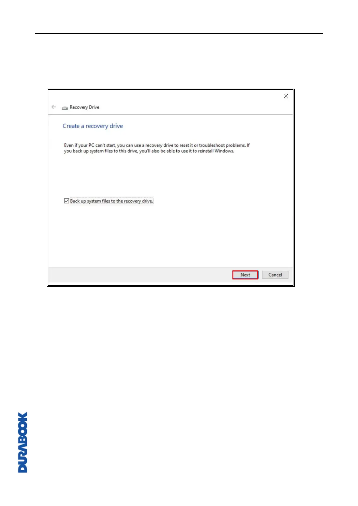 message. Check Back up system files to the recovery drive. option and