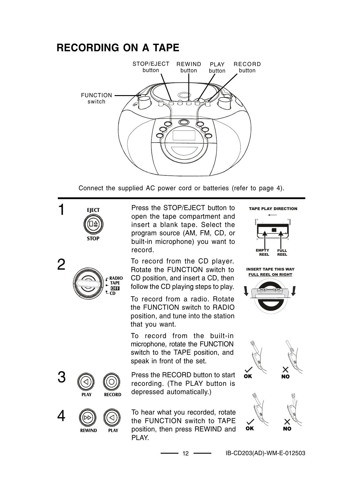 the FUNCTION switch to TAPE