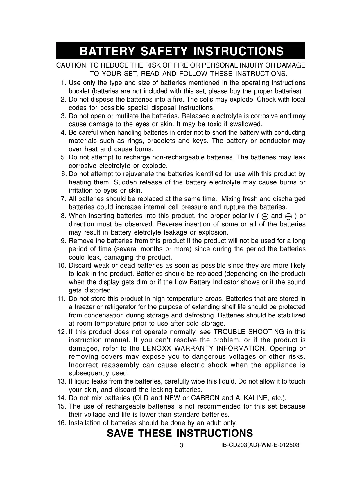 14. Do not mix batteries (OLD and NEW or CARBON and ALKALINE, etc.).