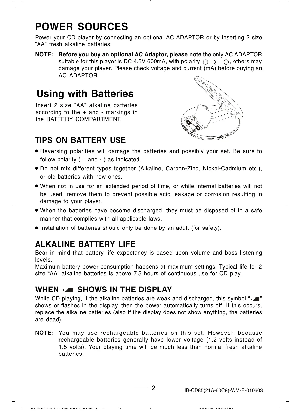Power your CD player by connecting an optional AC ADAPTOR or by inserting 2 size