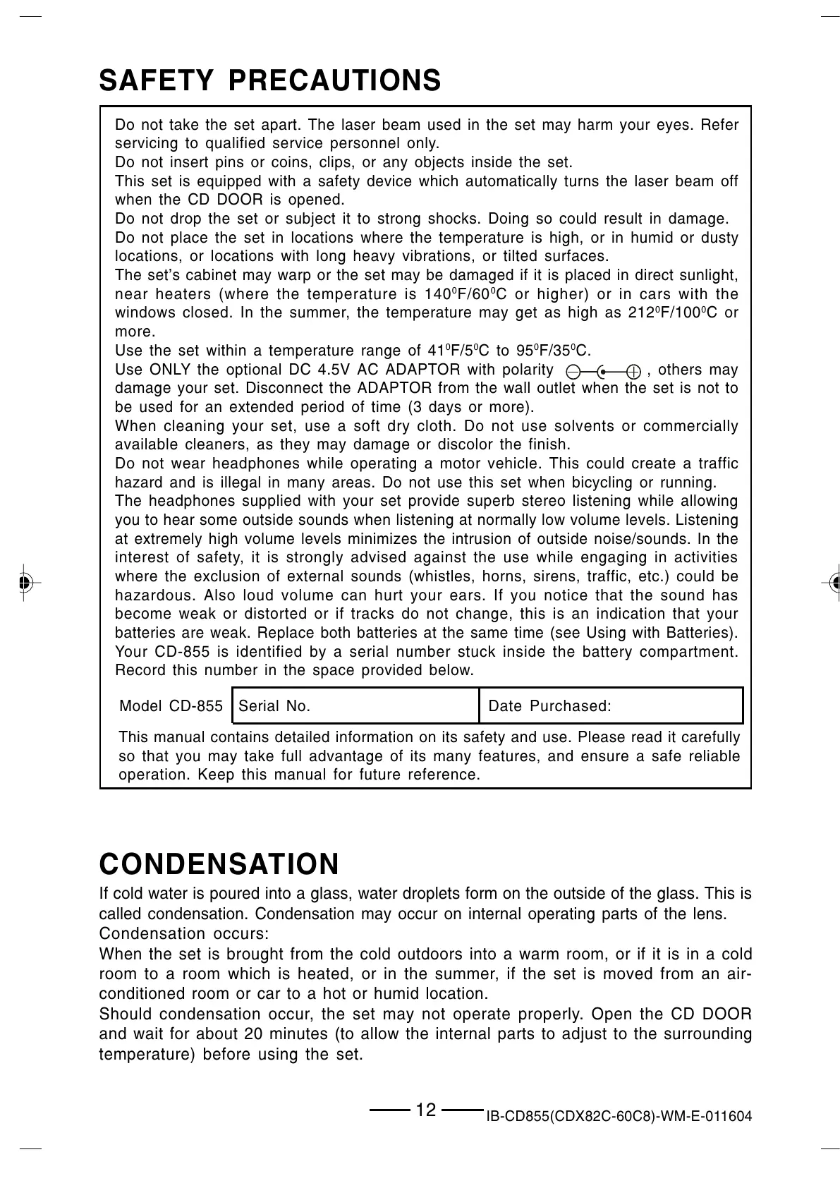 Model CD-855 Serial No. Date Purchased: