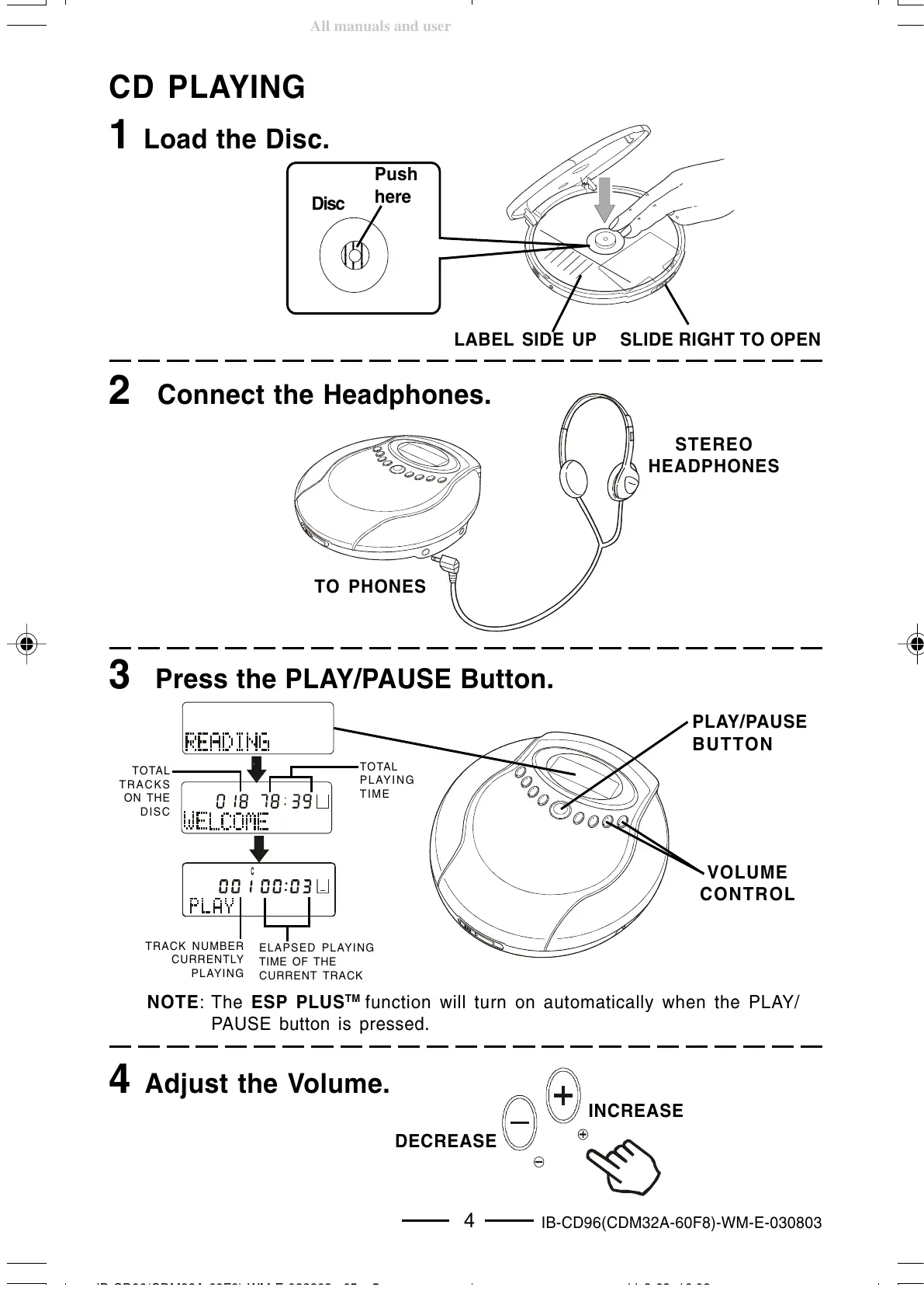 Durabrand CD-96 - Load the Disc; Connect the Headphones; Adjust the Volume
