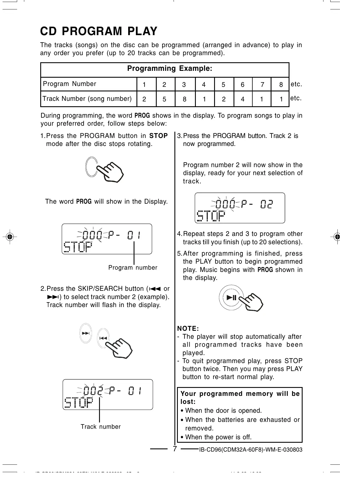 The tracks (songs) on the disc can be programmed (arranged in advance) to play in