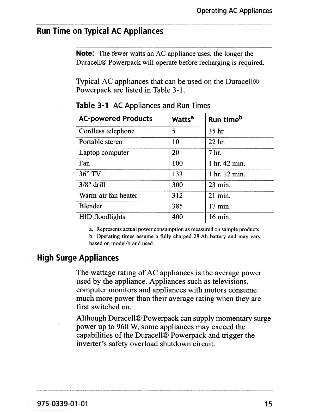 b. Operating times assume a fully charged 28 Ah battery and may vary
