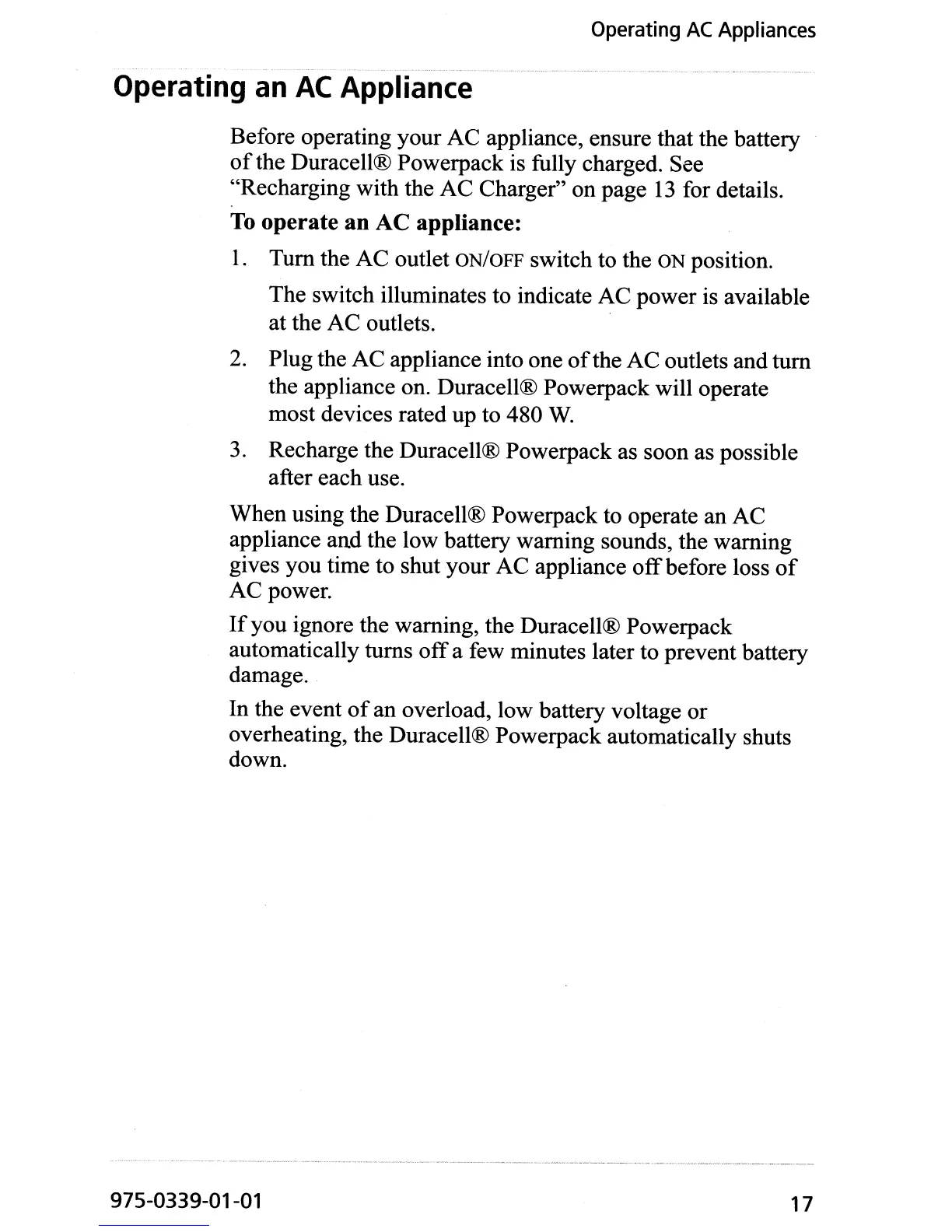 the appliance on. Duracell® Powerpack will operate