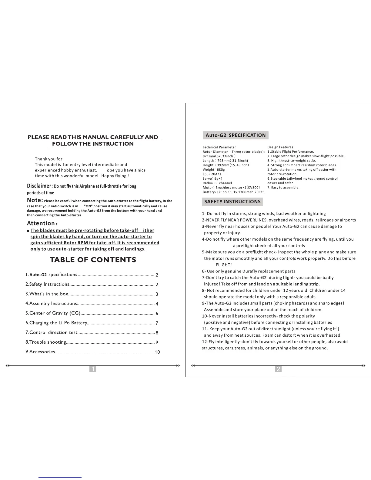 Durafly AUTO-G2 - Auto-G2 Specifications; Design Features; Safety Instructions