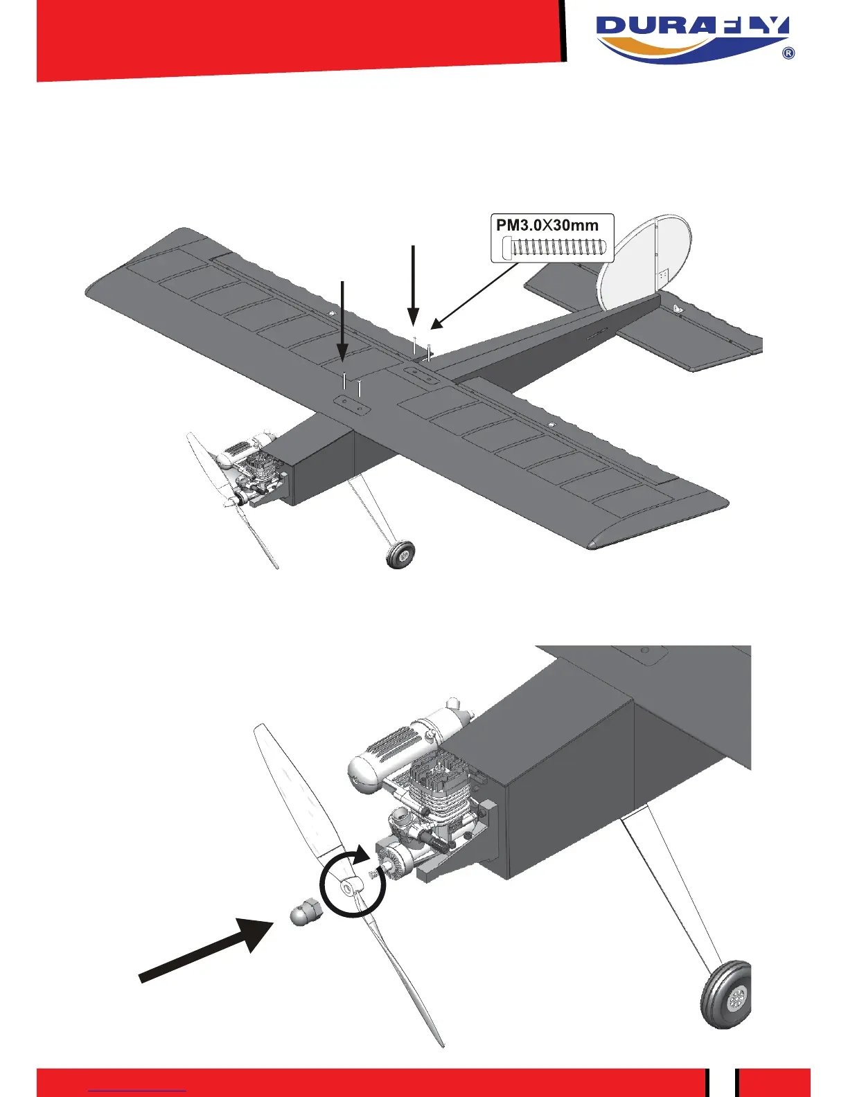 shaft and tighten firmly in place. Note: The Durafly logo on the prop faces outwards.