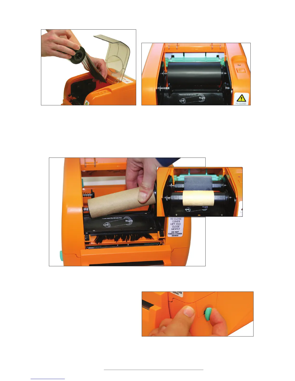E. Place the ribbon rewind spindle (with paper core) on the front hubs by inserting the