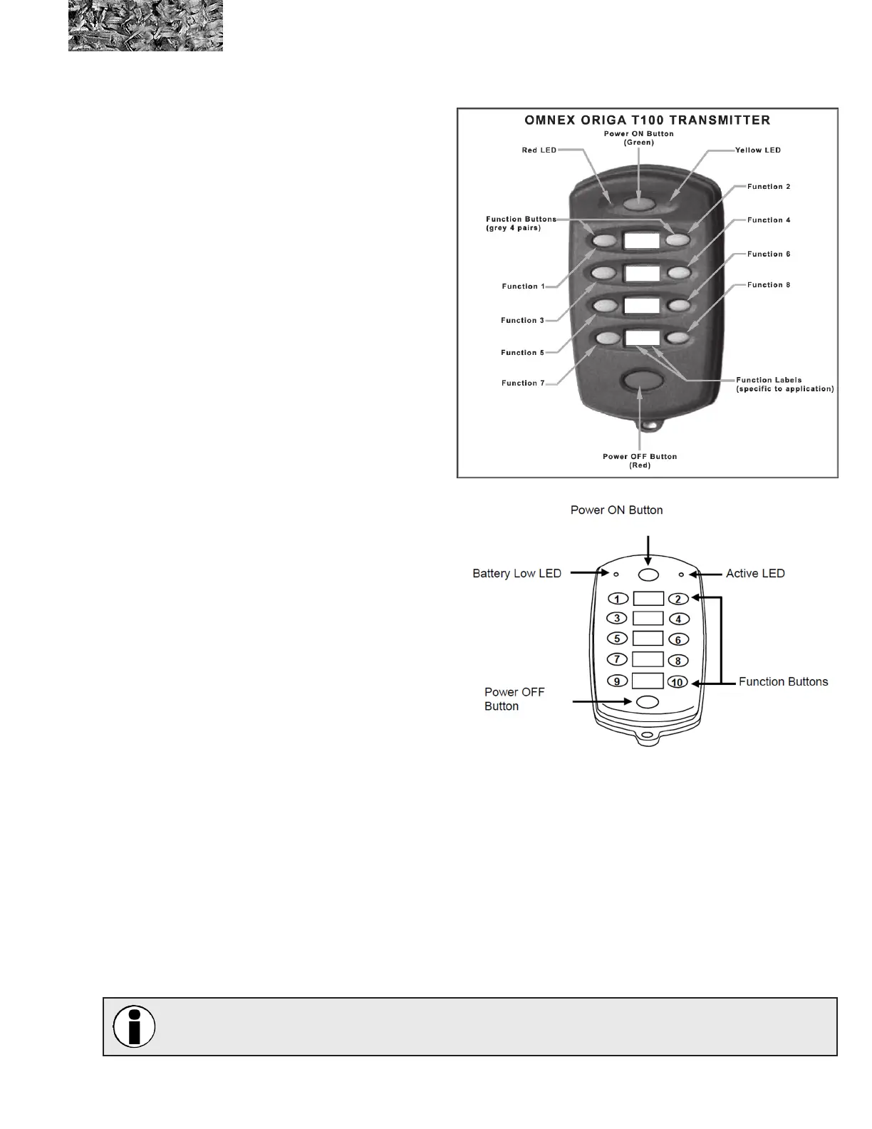 1. The Power ON (green) button powers up the transmitter. Output 9 on the receiver is energized when the