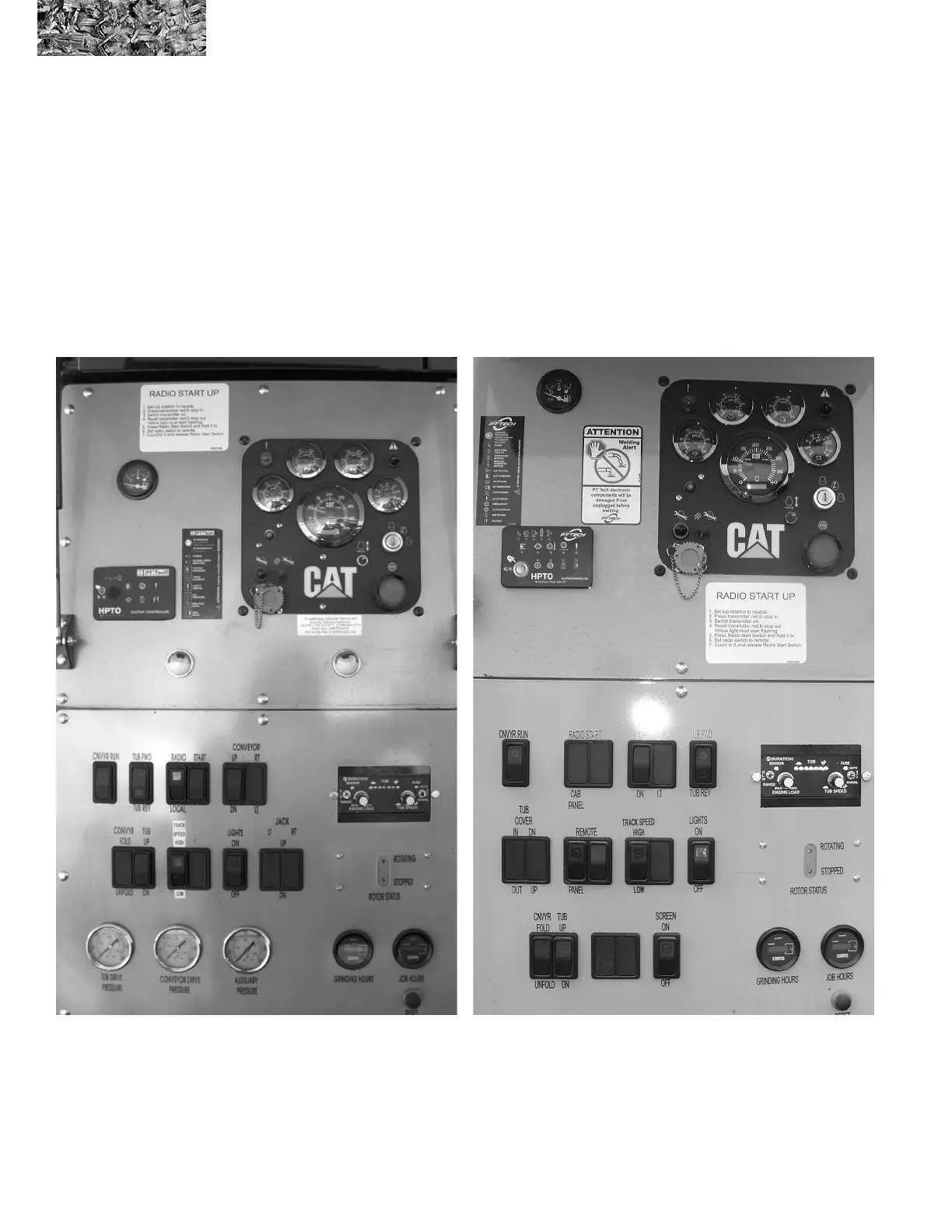 Gauges on the control panel include; tub circuit hydraulic pressure, conveyor hydraulic pressure, auxiliary hydraulic