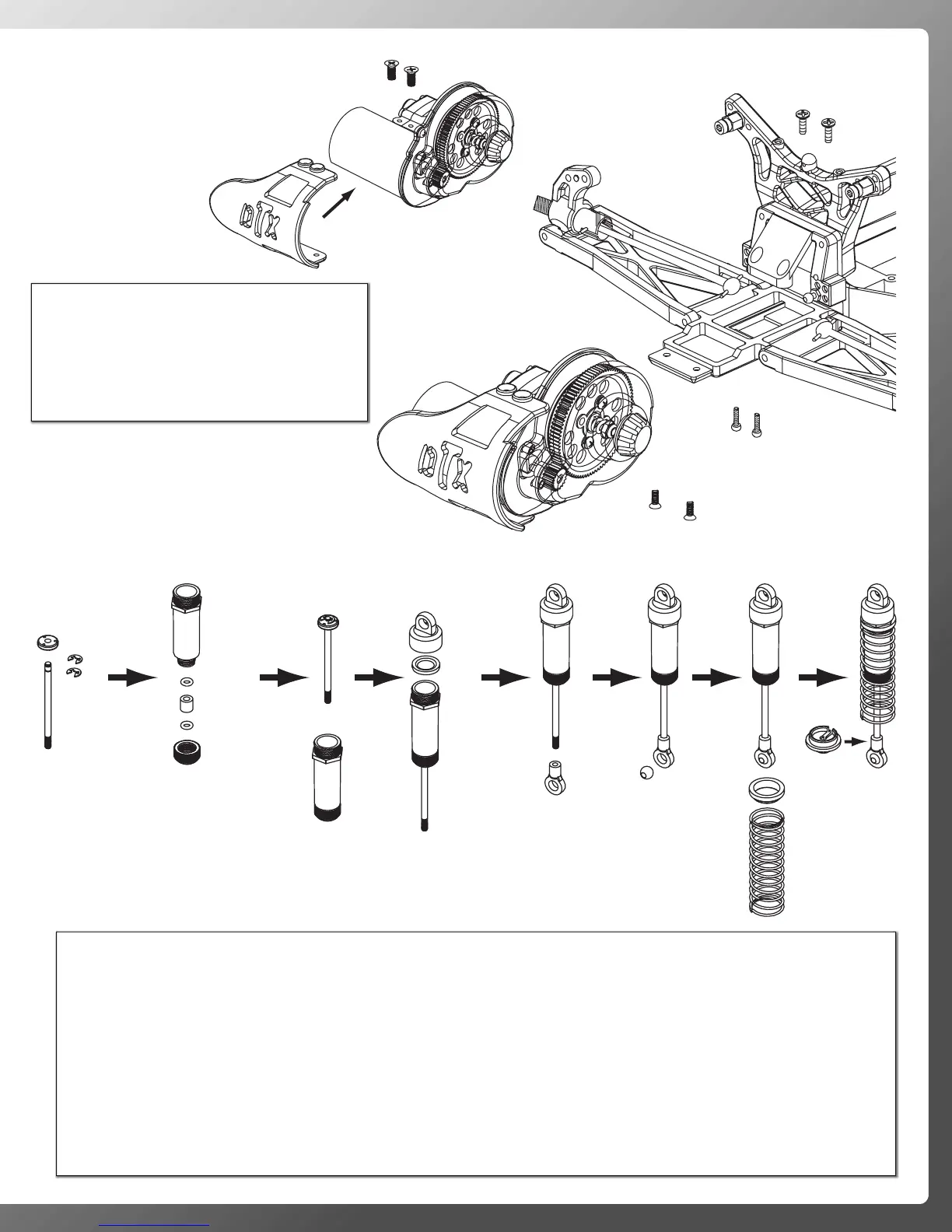 1. Install a 2.5mm e-clip (S) in the groove on the shock shafts (68,69) closest to the center of the shaft.