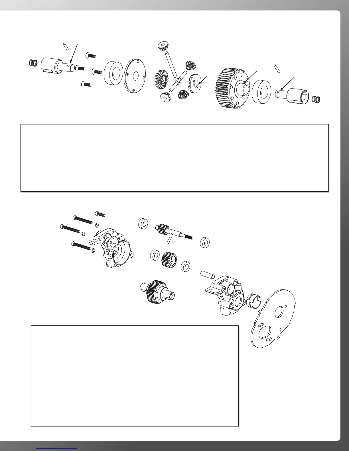 1. Place one of the 10x16mm bushings (110) on the bushing mounts on the diff gear case (18) and the diff gear case cover (12).