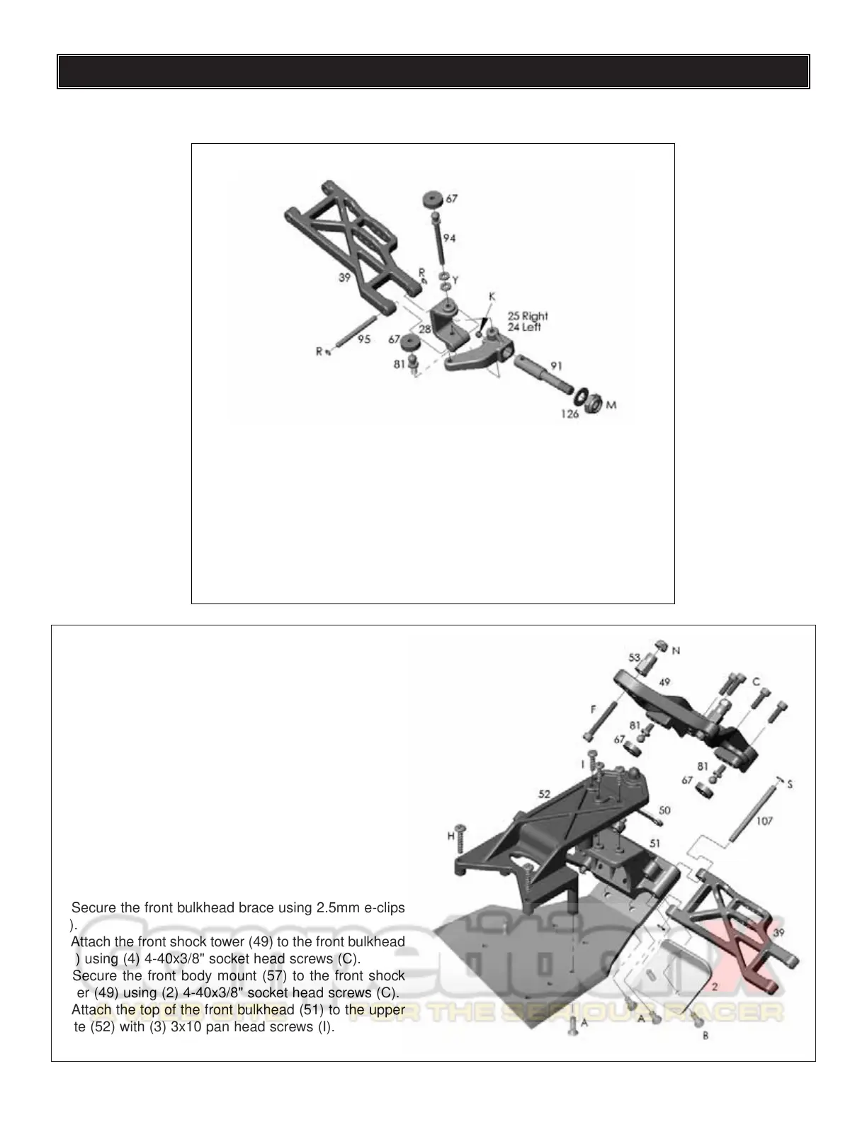 6. Attach the front shock tower (49) to the front bulkhead