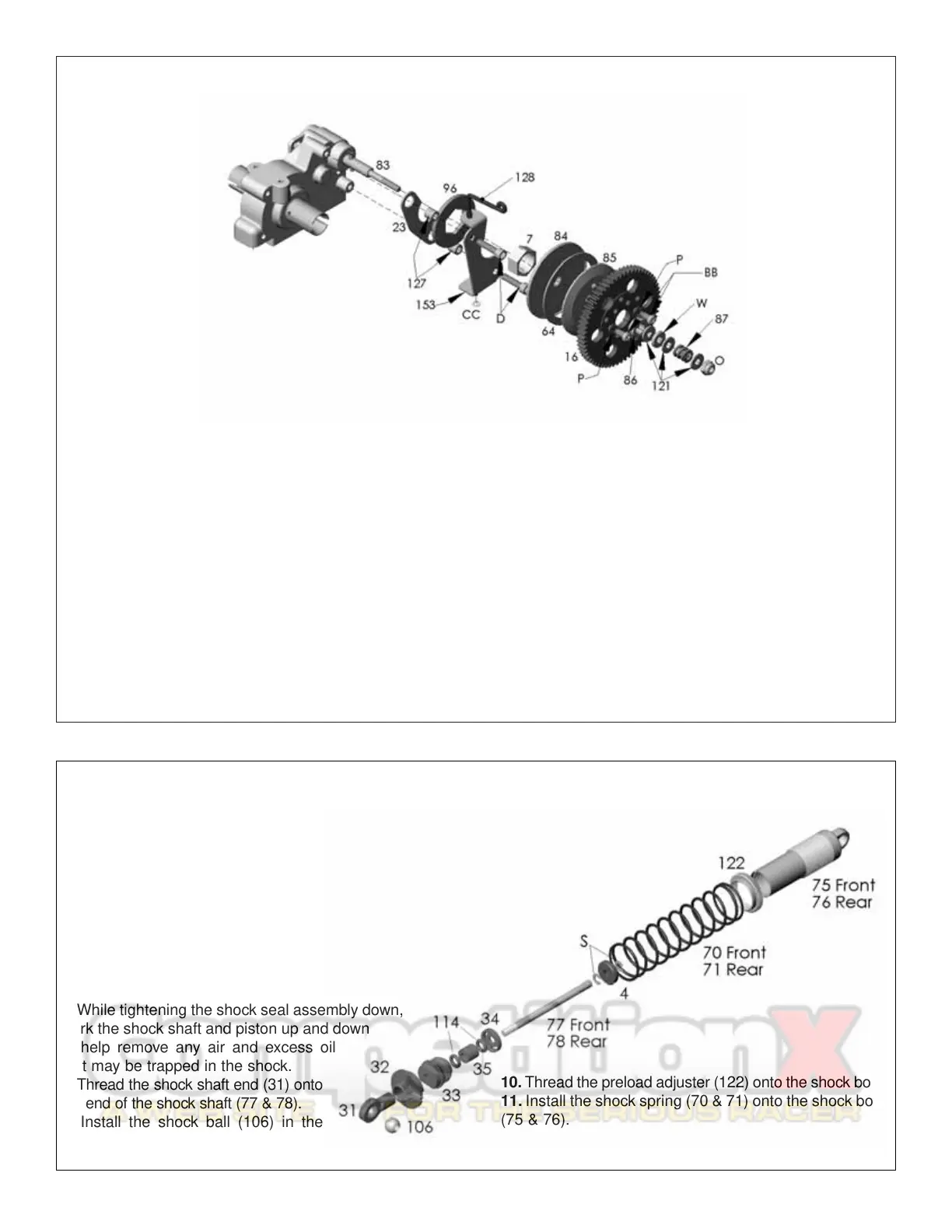 1. Install a 2.5mm e-clip (S) onto the shock shaft (77 & 78). Install the e-clip into the