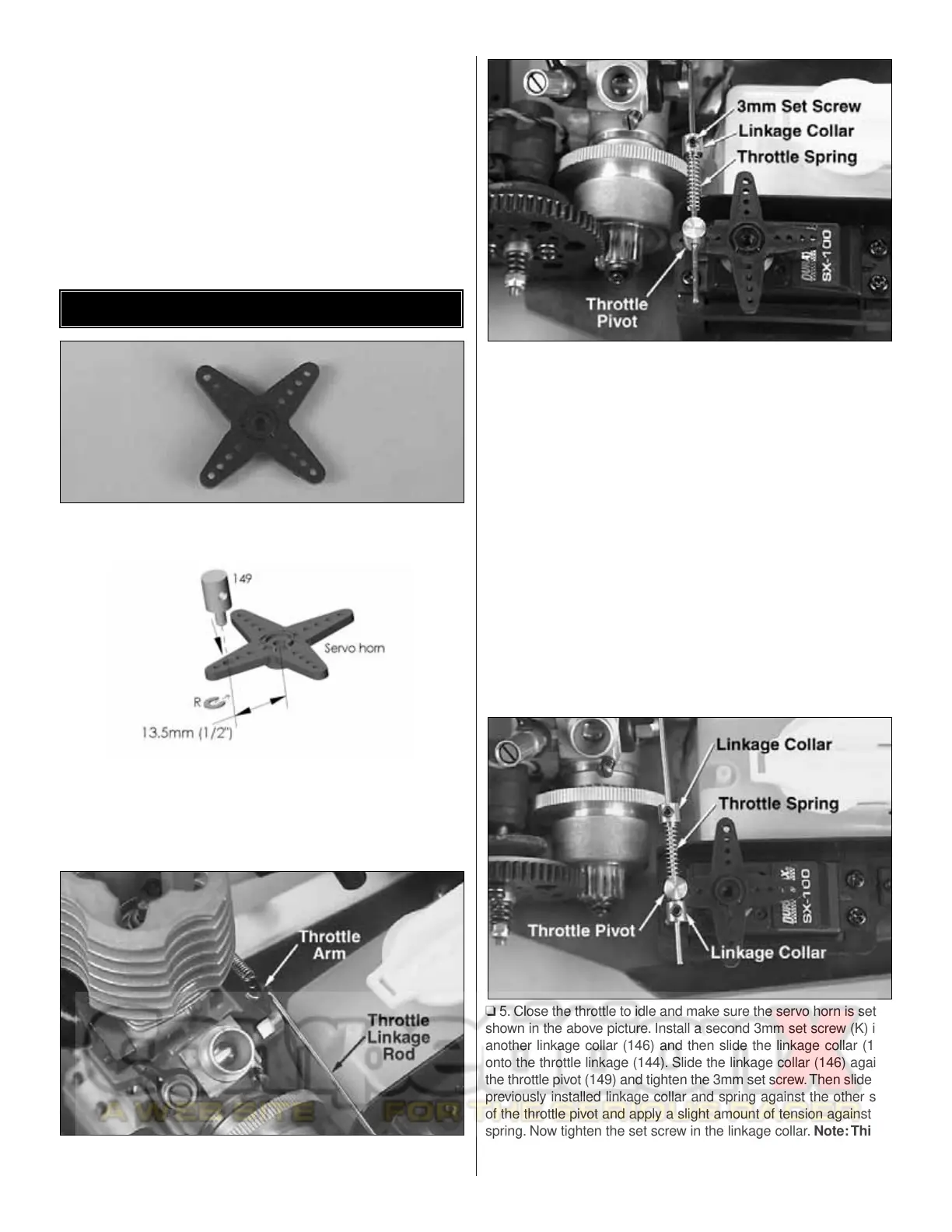 throttle servo horn onto the throttle servo. Do not install the servo
