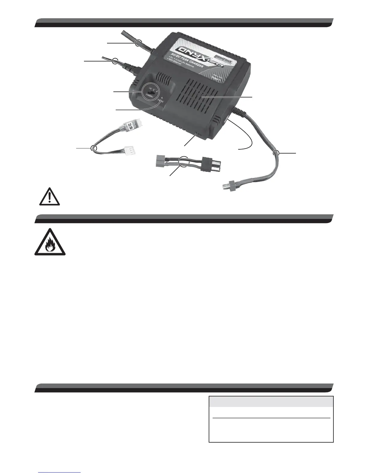 ● NEVER charge LiPo batteries at currents greater than the maximum rated current as specifi ed by the battery’s