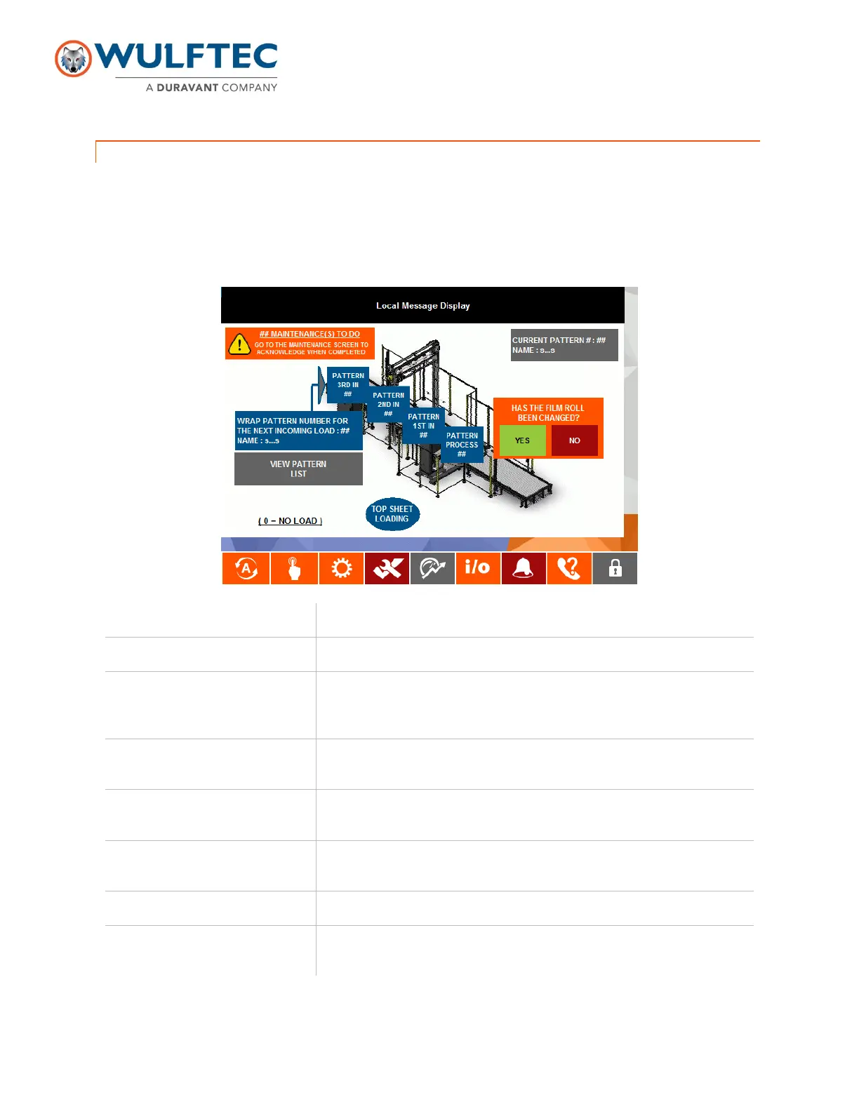 Indicates the current wrap pattern selection. Press to bring the operator to