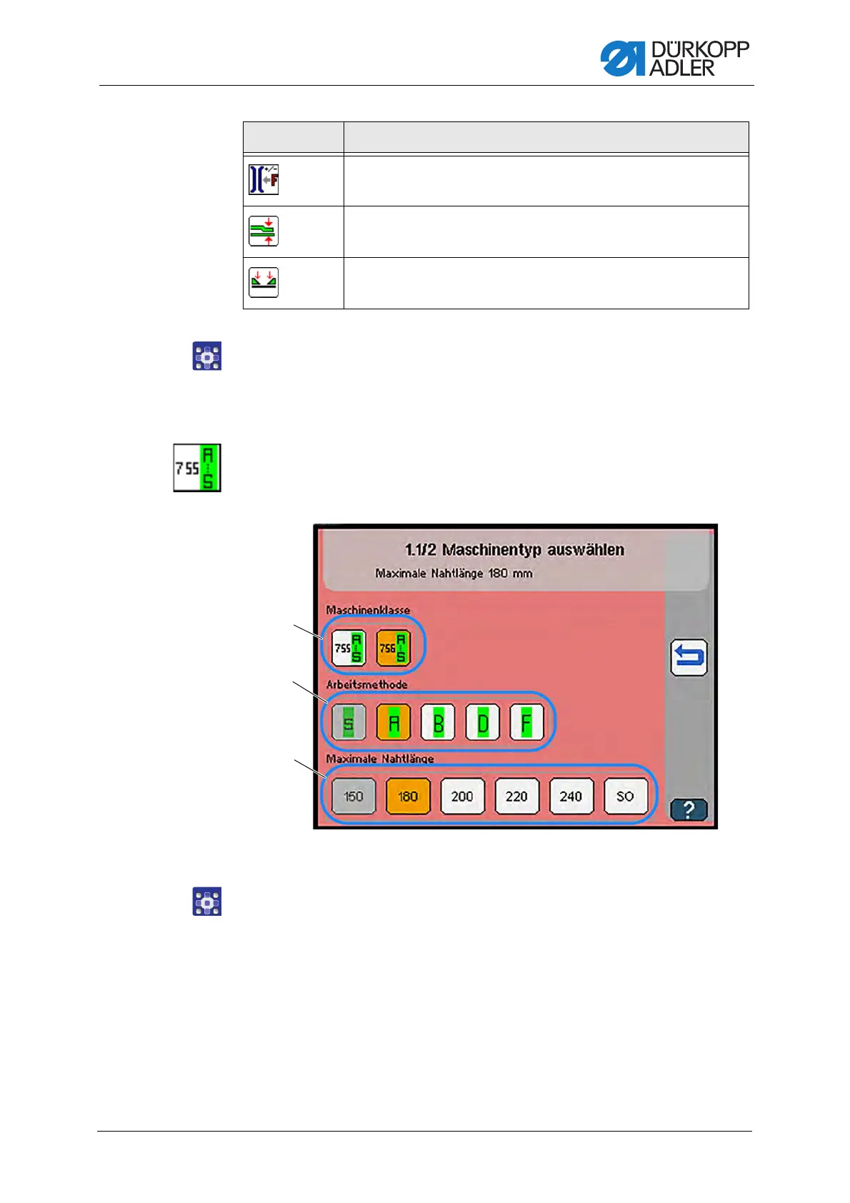 To select the machine class and the matching seam length: