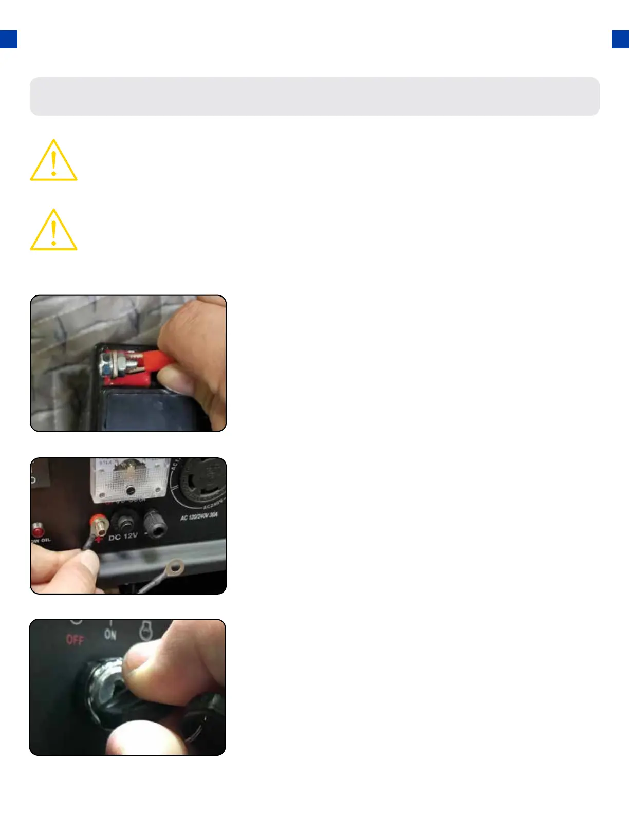 CAUTION: Never try to jump start a car with your generator.