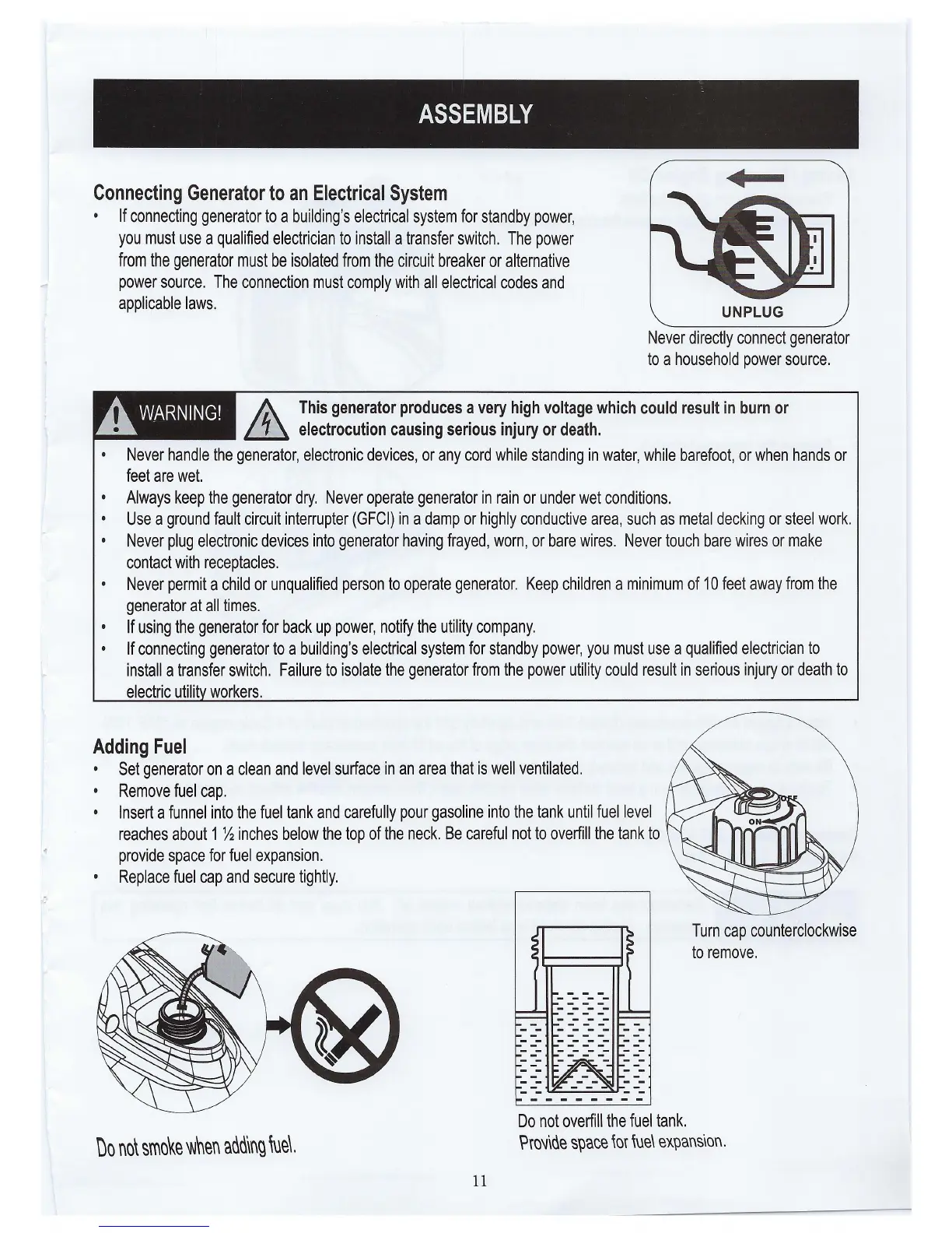 If connecting generator to a building's electrical system for standby power, you must use a qualified electrician to
