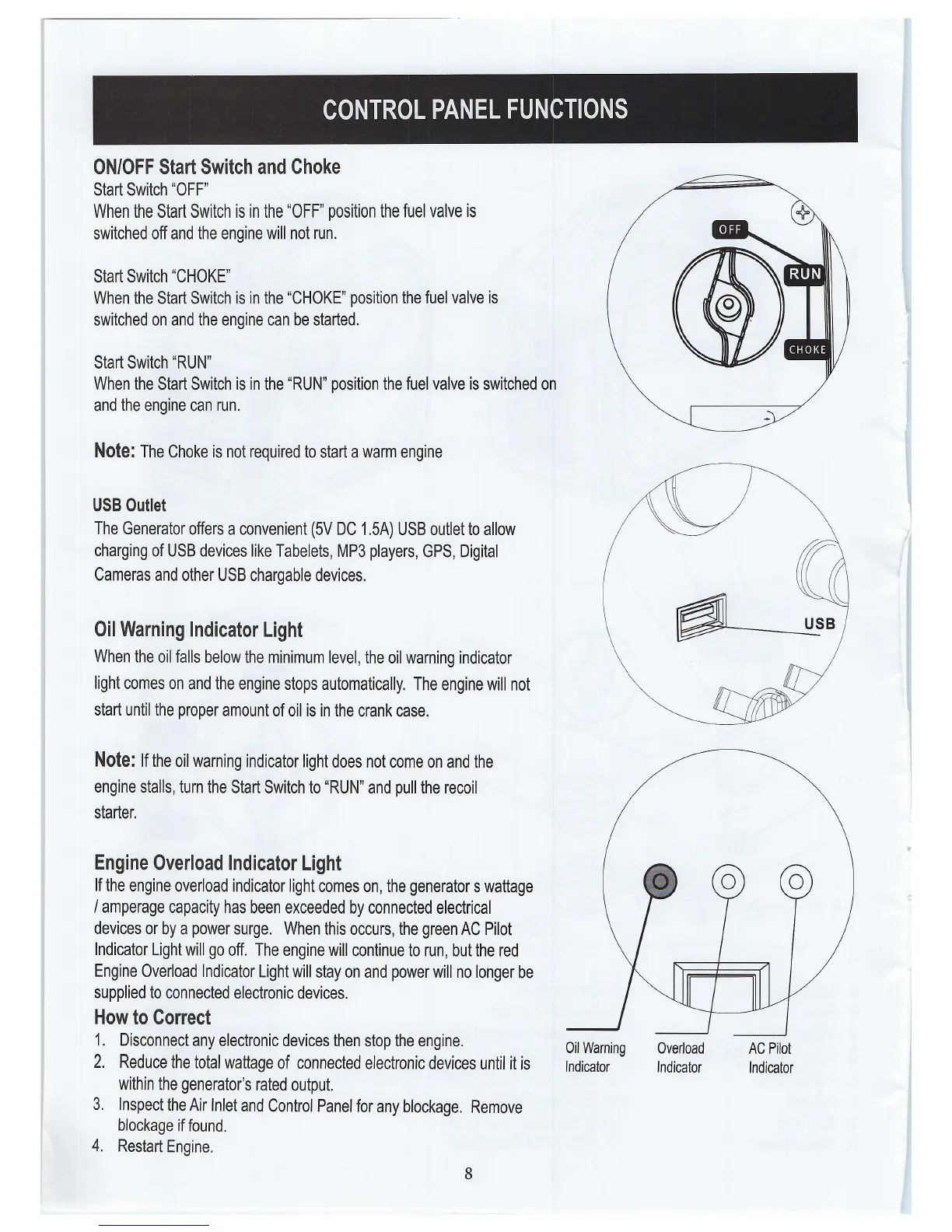 If the engine overload indicator light comes on, the generators wattage