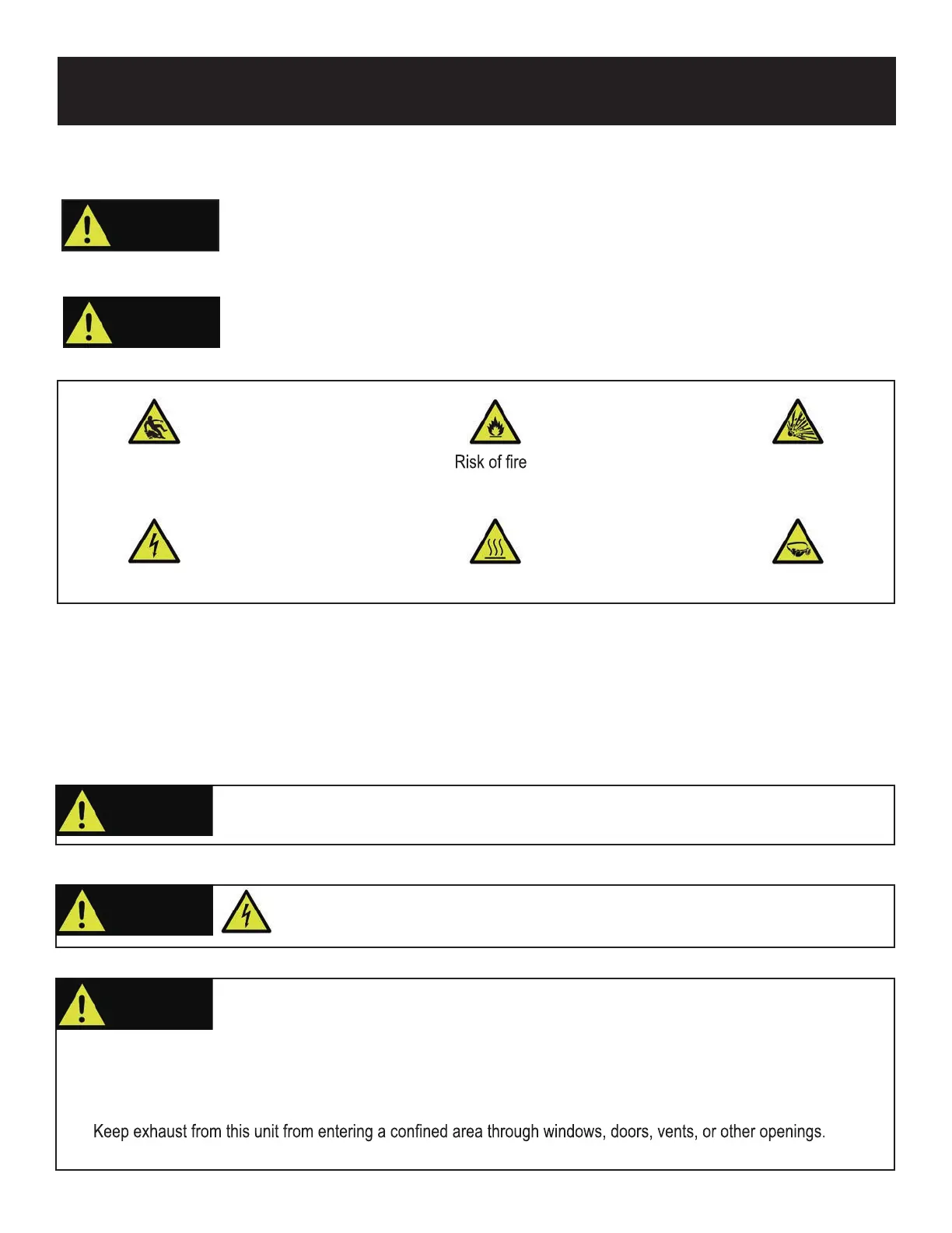 Do not operate indoors or in a confined space preventing dangerous carbon monoxide gas