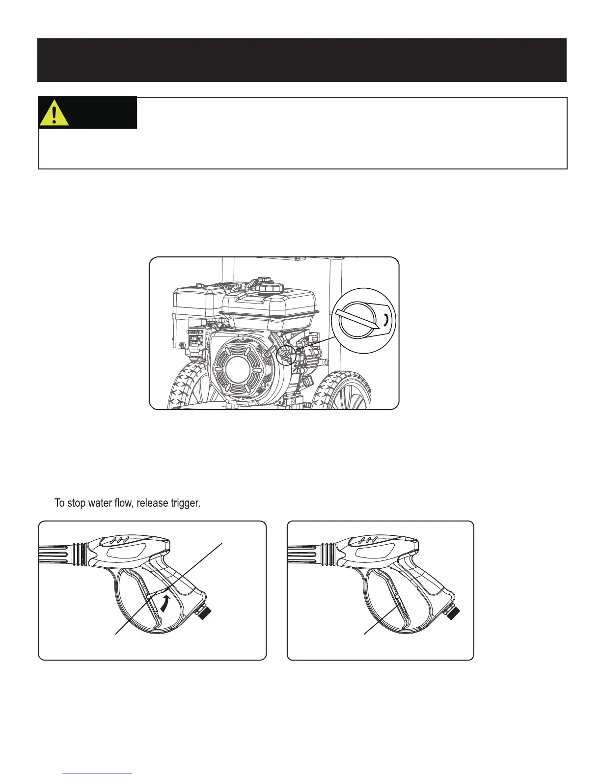 • Always relieve pressure from spray gun before pulling starter cord, including every failed attempt to start engine.